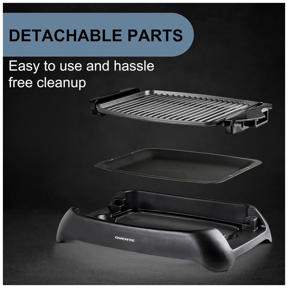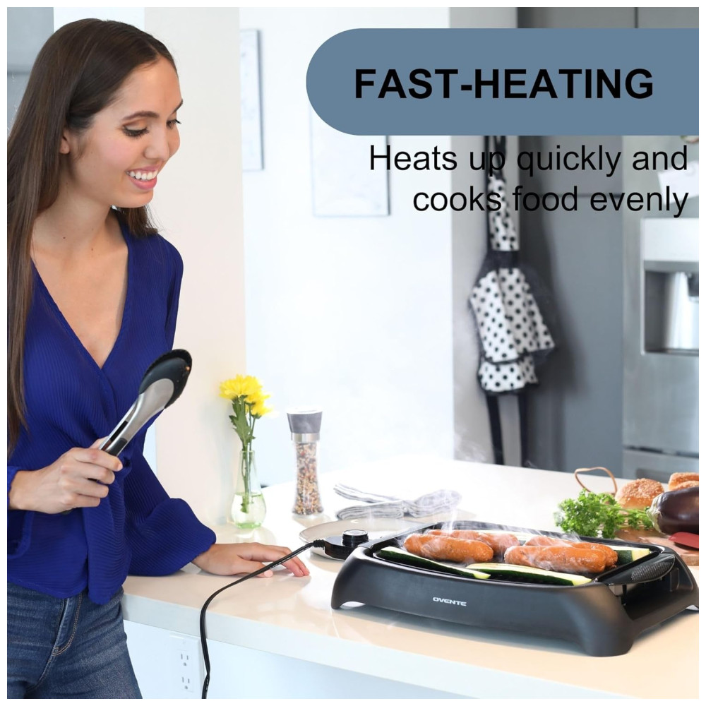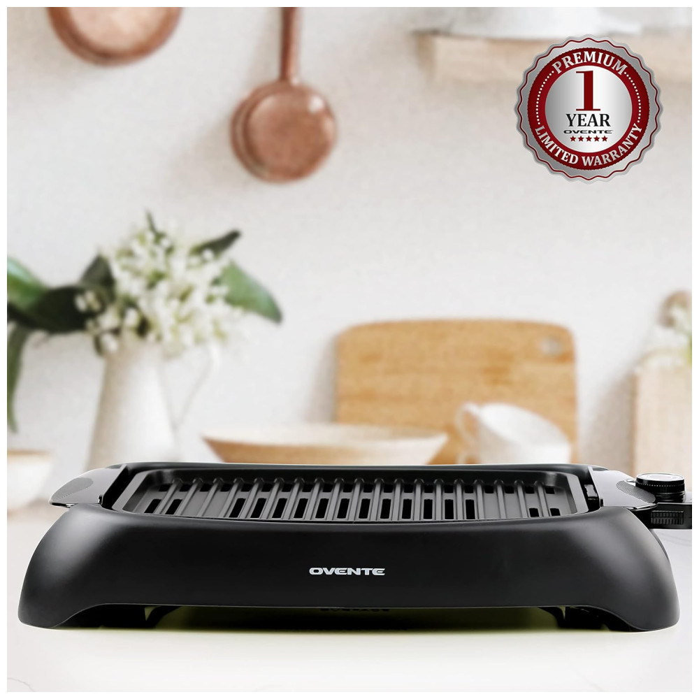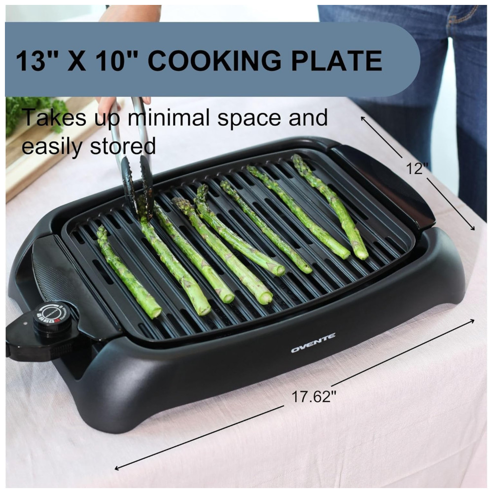 Churrasqueira Elétrica OVENTE com Revestimento Antiaderente de 33x25cm 1000W Controle de Temperatura Placa de Grelhar e Bandeja