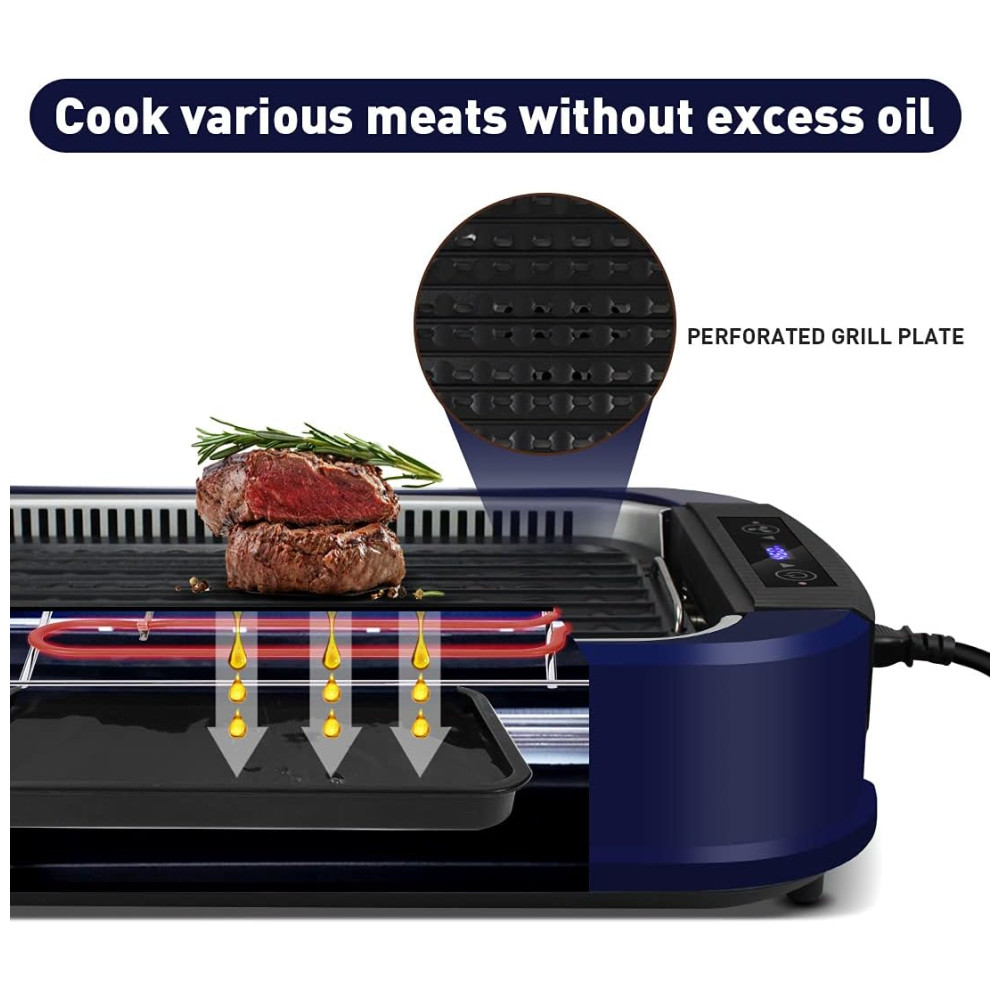 Aquece rápido e cozinha uniformemente Com os tubos de aquecimento Double U, esta grelha para churrasco interna fornece aos alimentos um aquecimento rápido e consistente, selando o sabor e a umidade e, em seguida, traz um bife suculento. A placa para grelhar perfurada pode filtrar o óleo em excesso e também deixar a carne com as marcas da grelha como uma grelha a carvão. Desfrute de um delicioso churrasco em poucos minutos.
