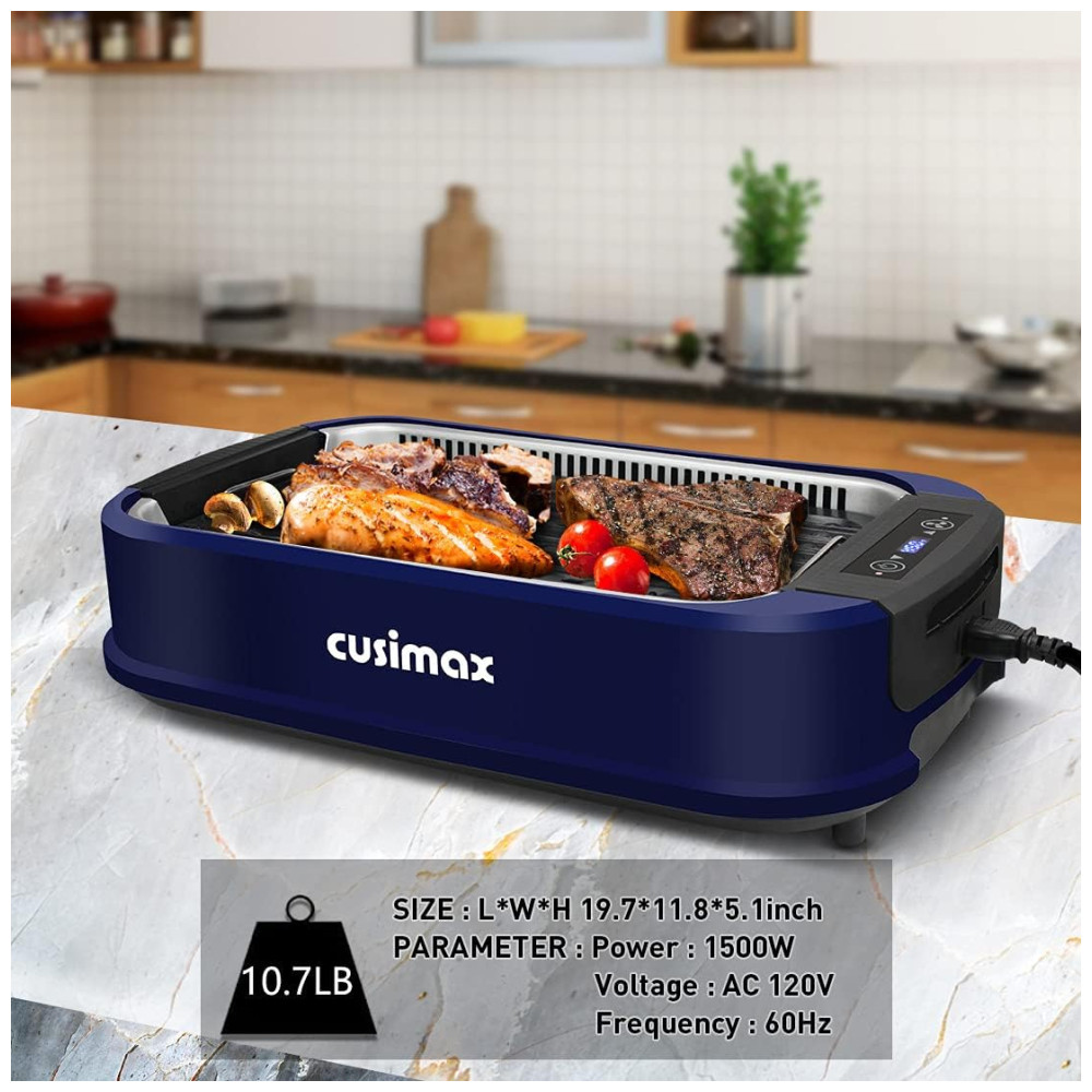 Grelhe quando e onde quiser Que alívio Não há necessidade de lutar contra o churrasco ao ar livre em uma tempestade e sufocar até a morte com a fumaça de sua churrasqueira ao ar livre ficando preso no guarda sol do pátio. A grade sem fumaça Cusimax NÃO MAIS FUMA NEBULOSA em sua casa. Apenas sentar e grelhar e comer churrasco em casa Esta grade elétrica interna economiza seu dinheiro indo para fora para churrasco. Aproveite o em um condomínio, trailer, festa ou pátio sem problemas.