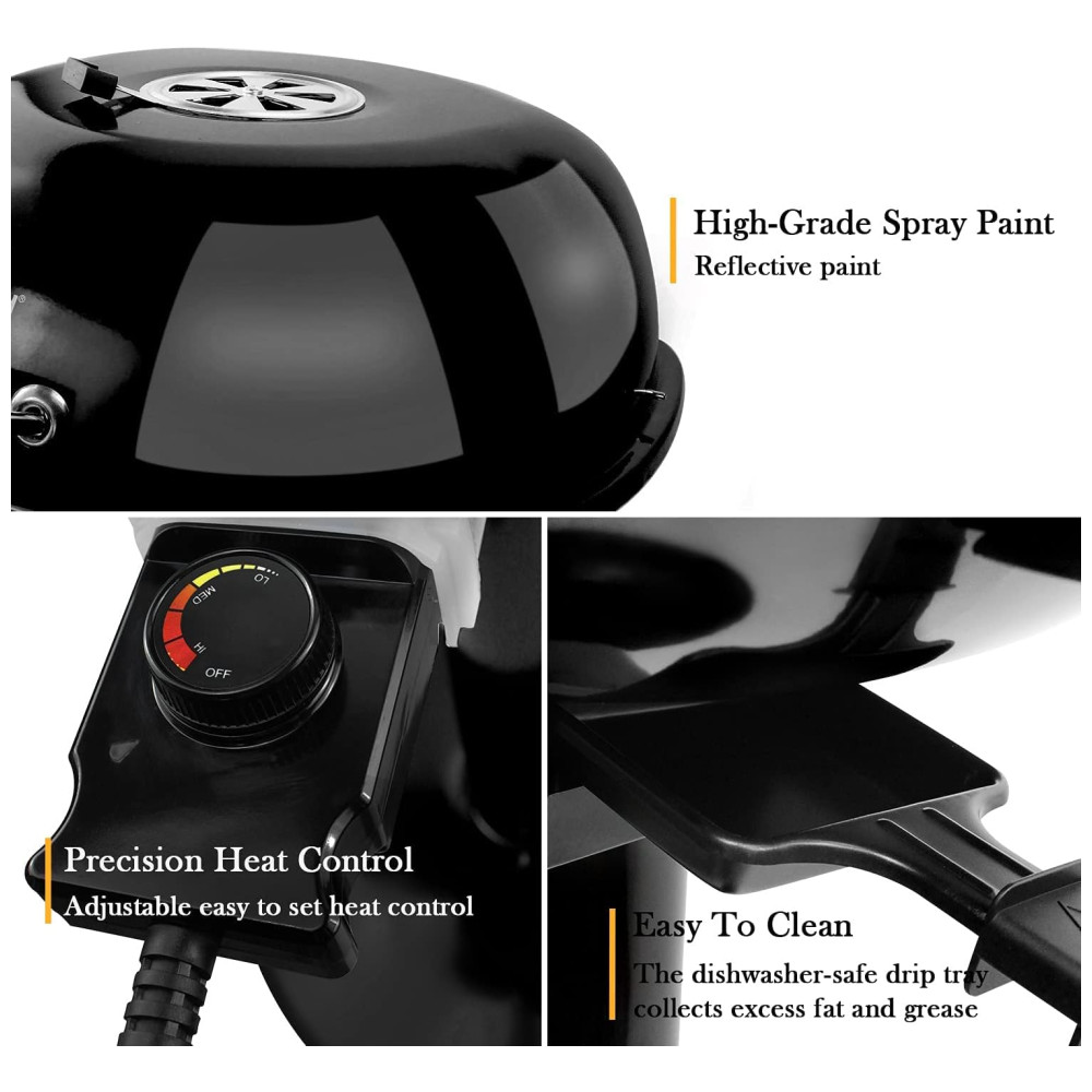 Aquecimento rápido Você pode ajustar o regulador de temperatura sensível para alterar a temperatura. A tampa da grelha pode garantir um ciclo de aquecimento rápido, o que torna a carne mais uniformemente aquecida, macia e suculenta. As crianças dos vizinhos serão atraídas por esta deliciosa comida