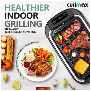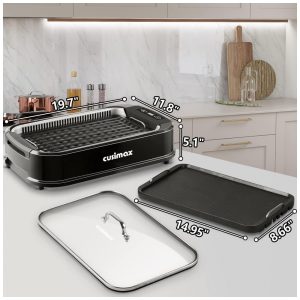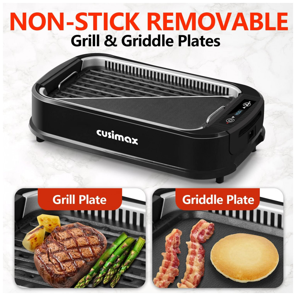 2 em 1 Grill Griddle com tampa de vidro Basta trocar a placa superior da grelha, chapa como quiser. A grelha elétrica Cusimax oferece a possibilidade de terminar as refeições do dia inteiro em UM dispositivo, economizando o custo extra de comprar outro dispositivo A tampa de vidro também acelera o cozimento dos alimentos e retém o calor, além de ser conveniente para ver sua comida.