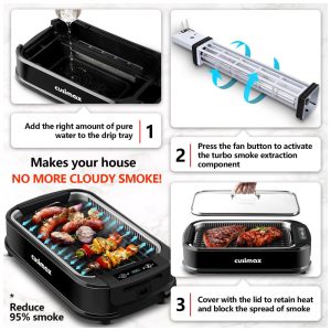 Grelhe quando e onde quiser A churrasqueira elétrica sem fumaça Cusimax é ideal para qualquer situação de grelhar em ambientes fechados, especialmente aqueles em pequenos espaços confinados como um apartamento na cidade. Isso faz com que sua casa NÃO FUME MAIS NEBULOSA. Não há necessidade de lutar com grelhar do lado de fora em uma tempestade e sufocar até a morte com a fumaça de sua churrasqueira ao ar livre ficando presa no guarda sol do pátio. Apenas sentar e grelhar e comer churrasco em casa Esta churrasqueira interna elétrica ainda economiza seu dinheiro ao sair para churrasco.