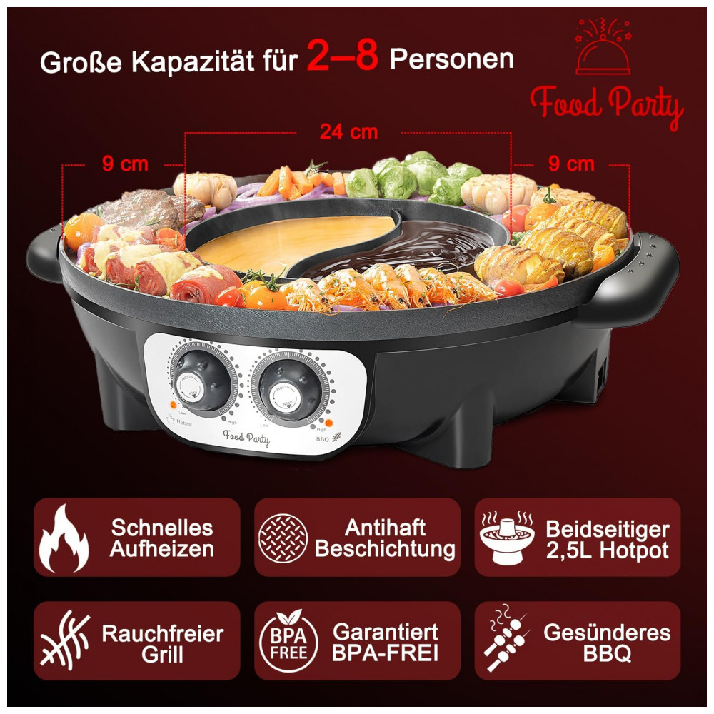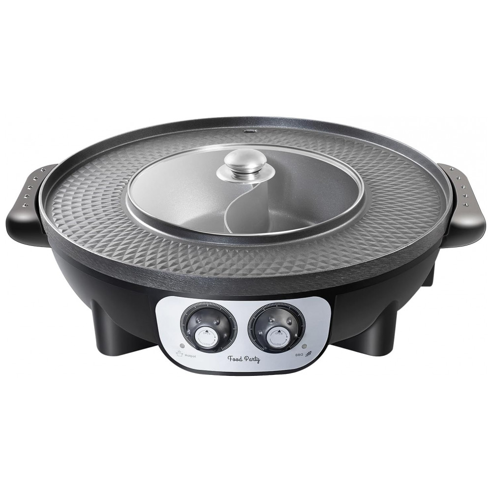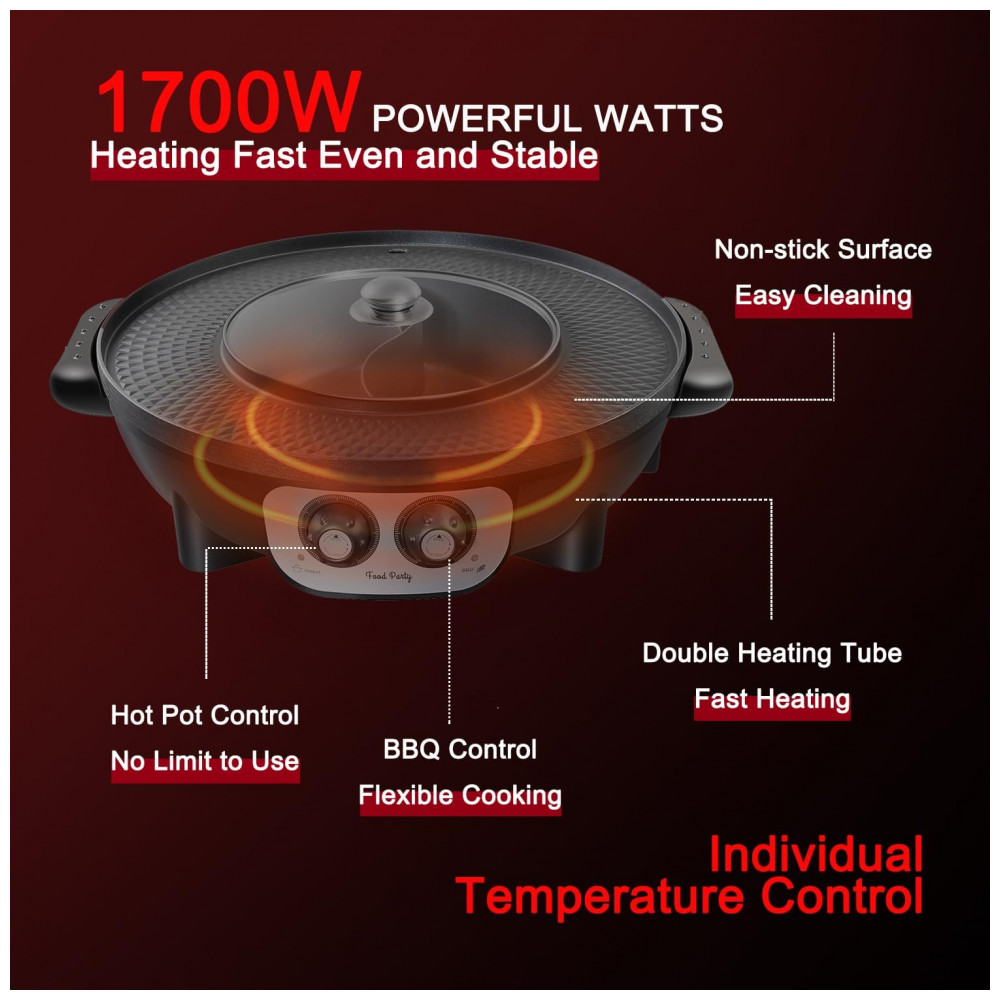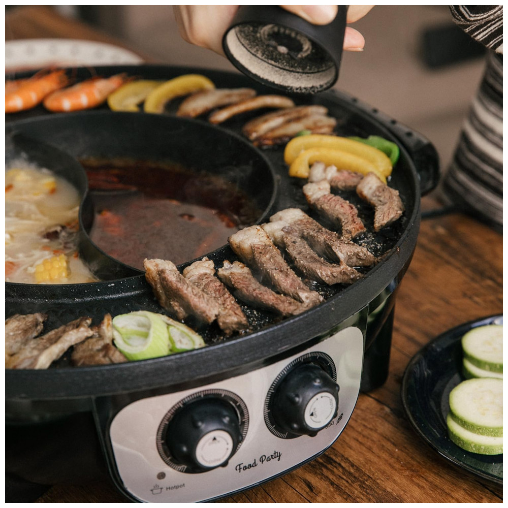 Fácil de entreter 1 8 pessoas. O hotpot contém 2L qt de líquido. A largura da superfície da grelha é de 3,5 pol. . Hotpot e grill funcionam juntos ou individualmente com controle de temperatura independente