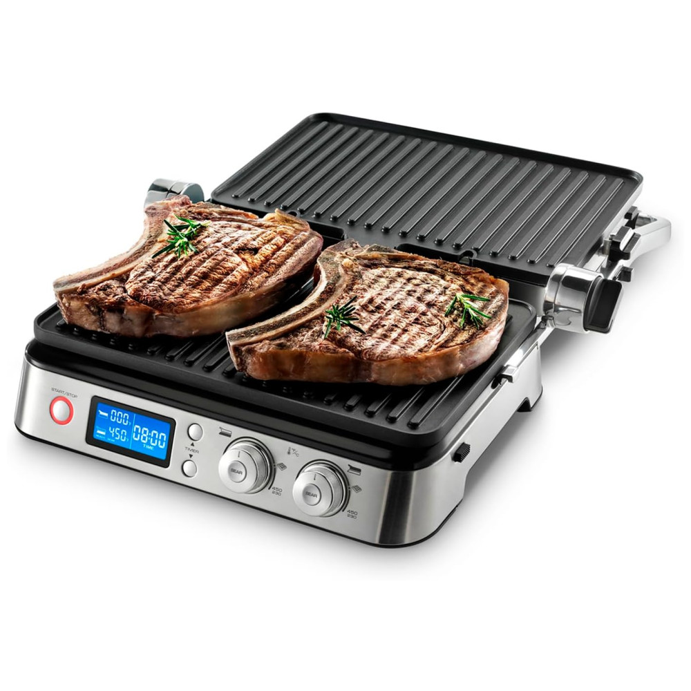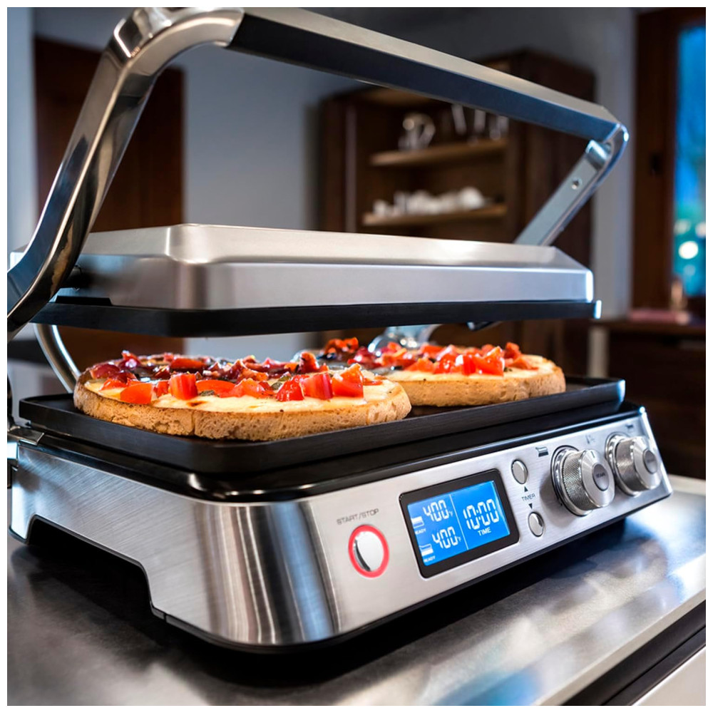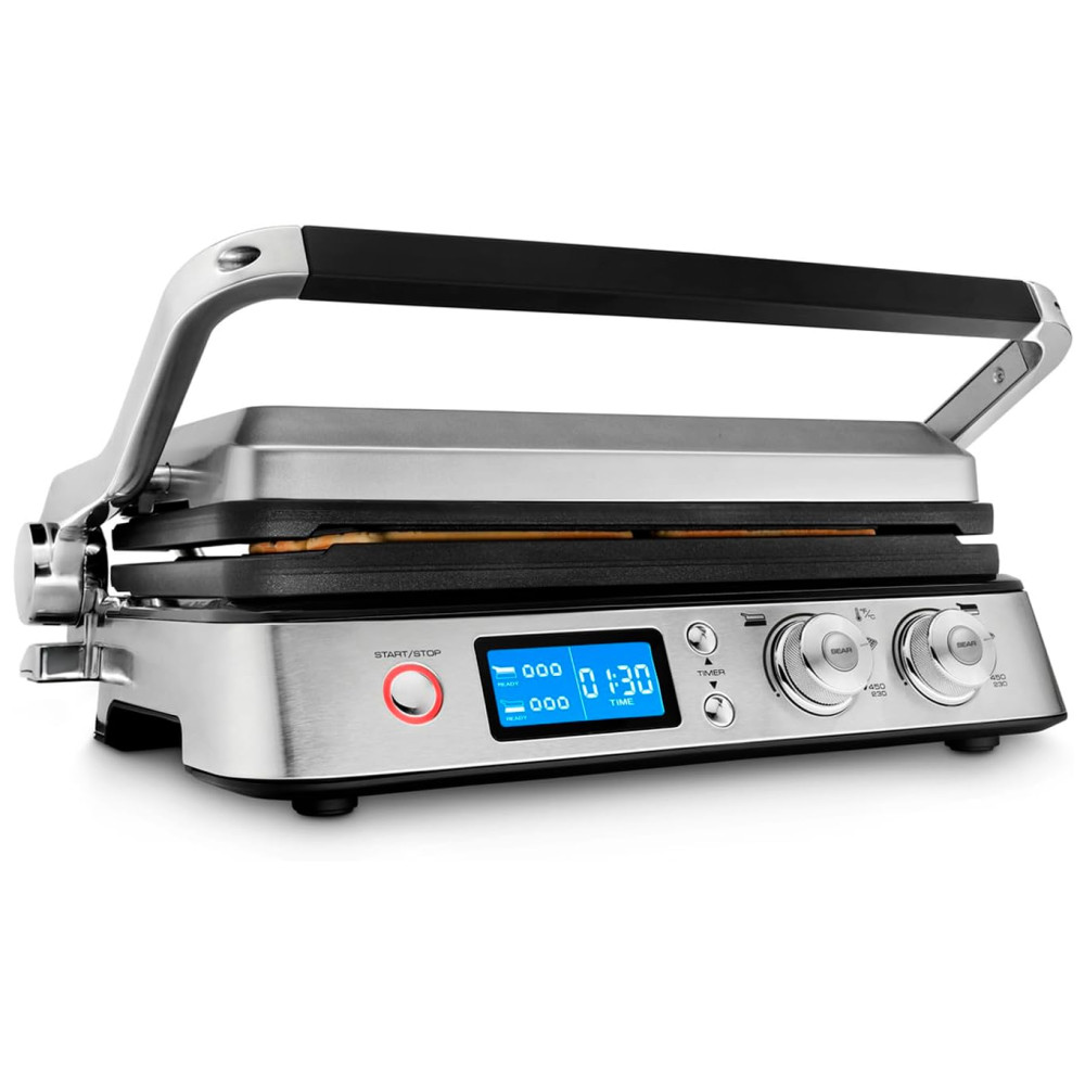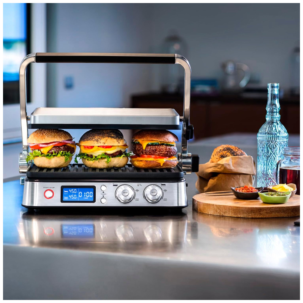 7 funções de cozimento grelhar de contato e prensa panini, grelha totalmente aberta, grelha totalmente aberta, meia grelha, meia grelha, modo waffle e modo forno de grelha