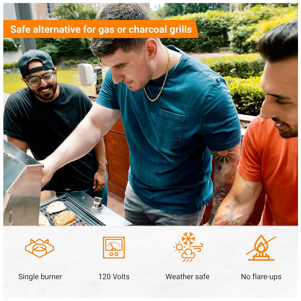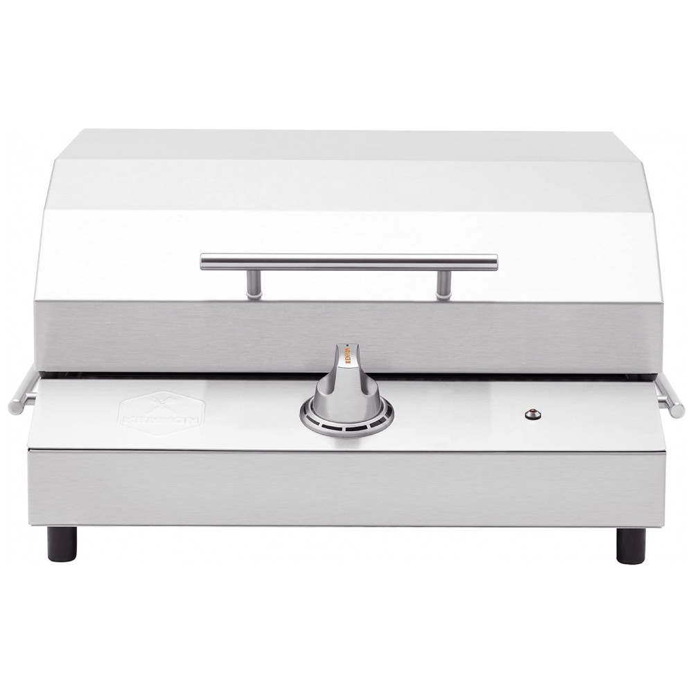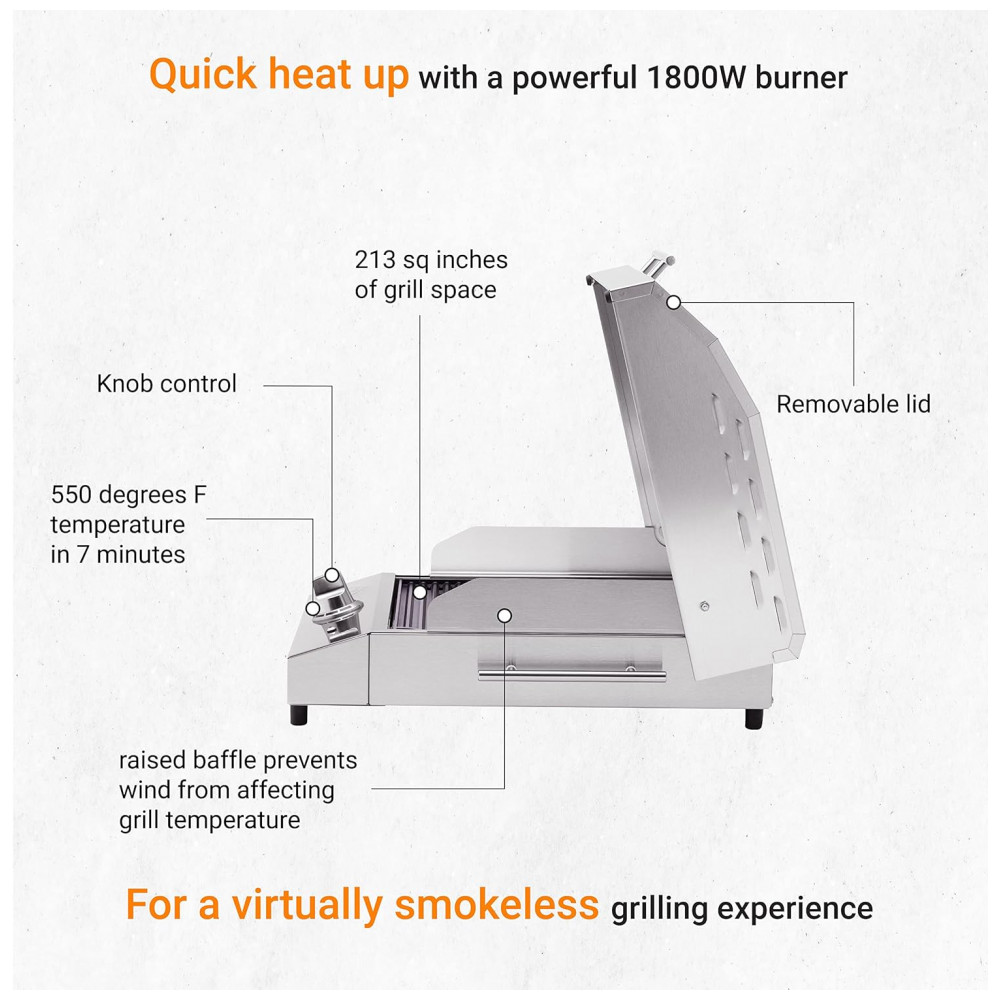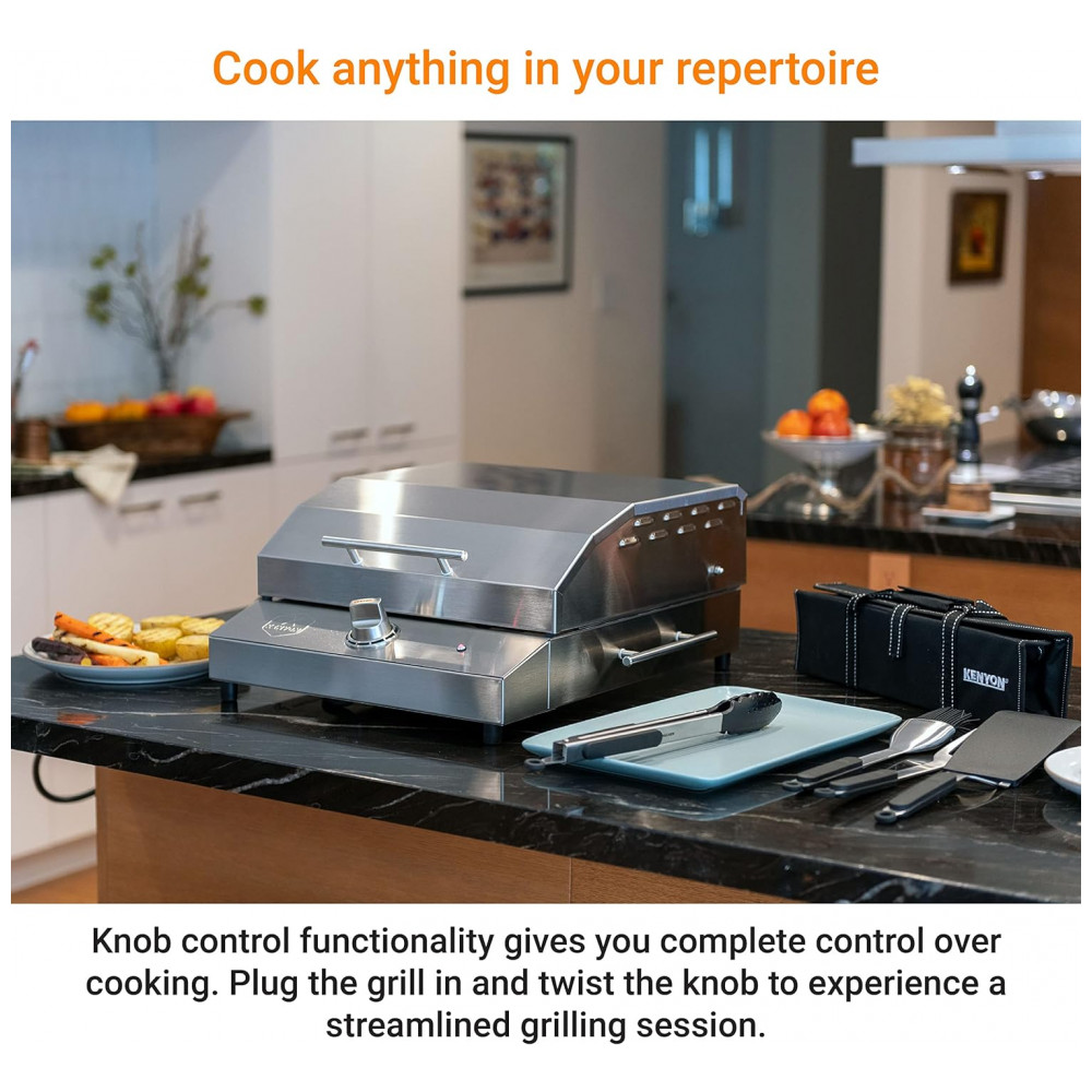 Grelha de queimador único A grelha elétrica de mesa portátil Kenyon G2 é uma grelha de queimador único com um poderoso elemento de 1800 W e 540c2 de espaço na grelha. A temperatura real de cozimento excede 260 C sem fumaça ou chamas.