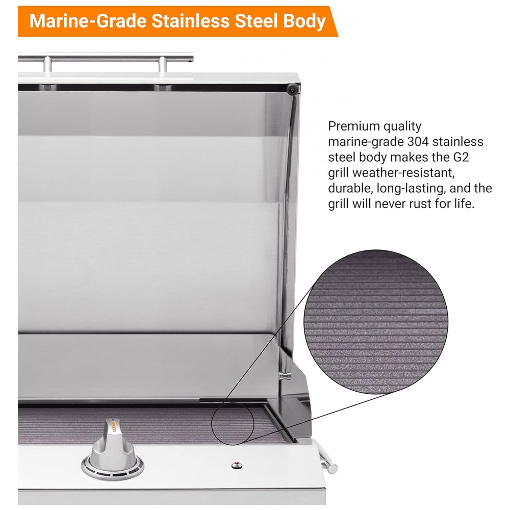 Corpo de aço inoxidável O corpo de aço inoxidável 304 de grau marinho de qualidade premium torna a grelha externa e interna resistente às intempéries, à prova de ferrugem para toda a vida, durável e duradoura.