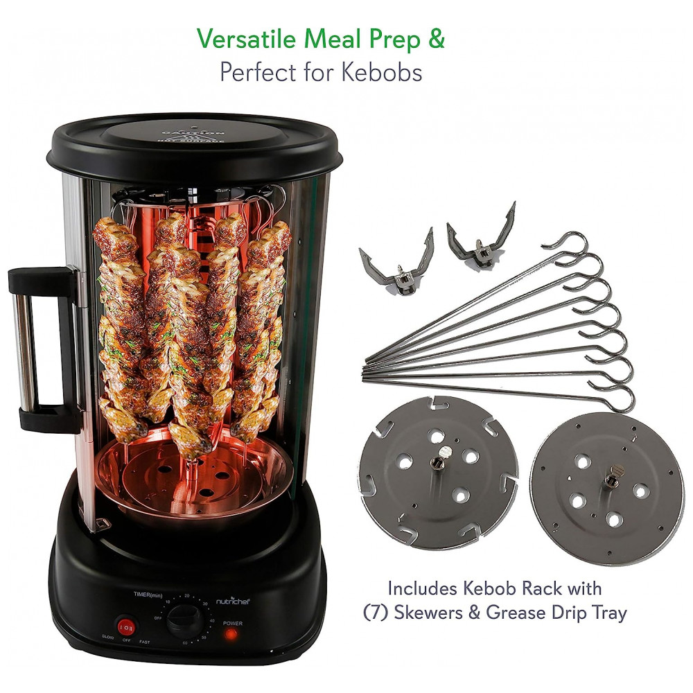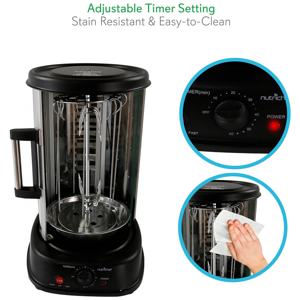 FÁCIL DE LIMPAR O forno rotisserie possui carcaça resistente a manchas para facilitar a limpeza Inclui um rack de kebob com sete espetos e bandeja de gotejamento de gordura para cozinhar sem bagunça
