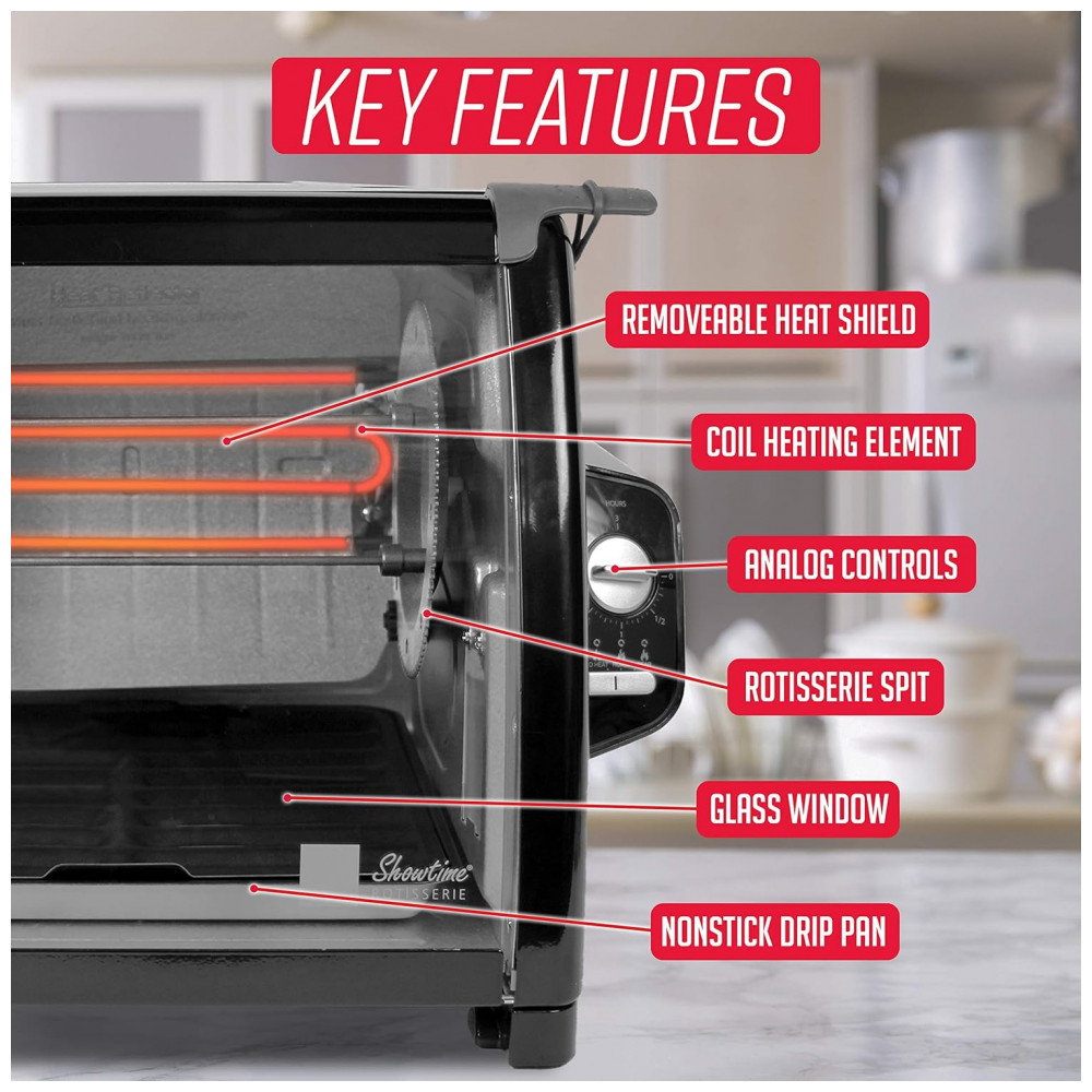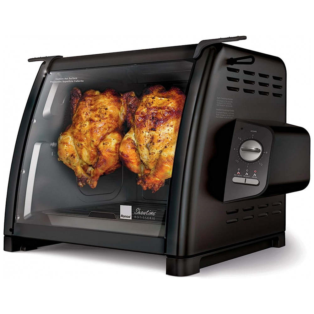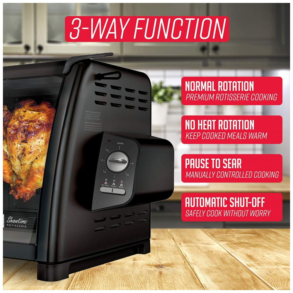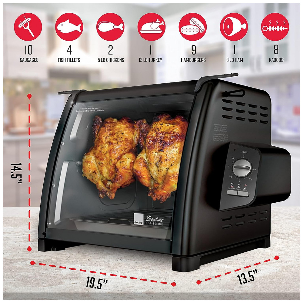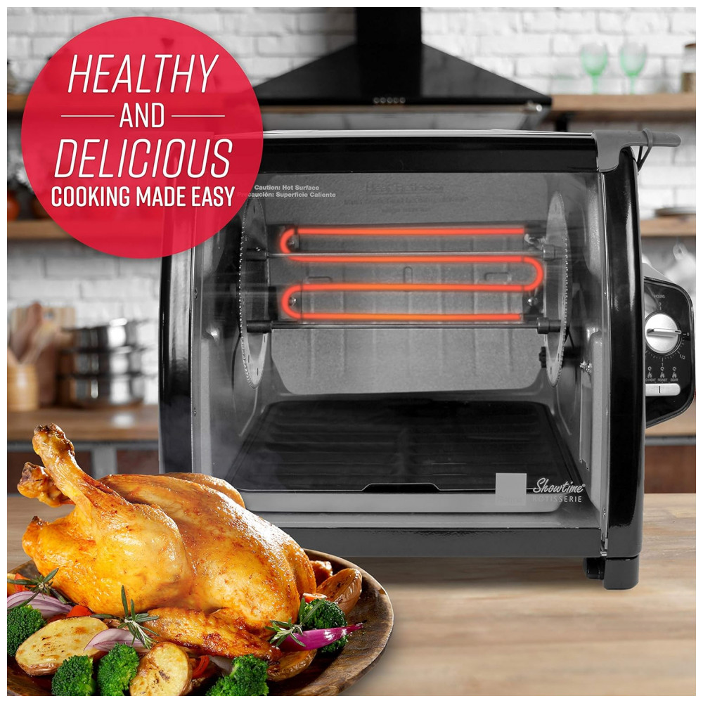 FORNO DE GRANDE CAPACIDADE O interior é grande o suficiente para cozinhar até um peru de 6,5 kg ou 2 frangos inteiros de cada vez, mas com apenas de altura e de largura, o Showtime Modern Rotisserie é compacto para caber em armários para facilitar o zenamento quando não estiver em uso.