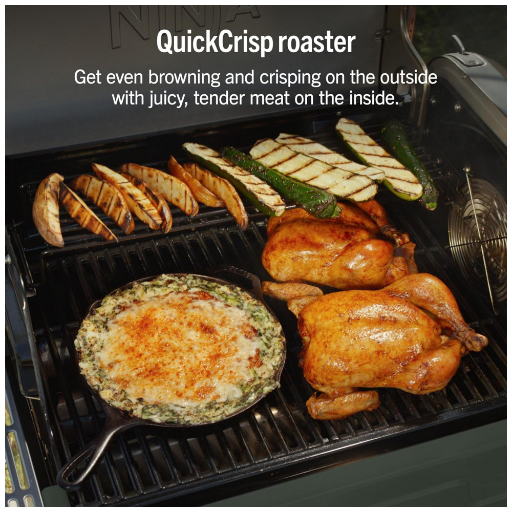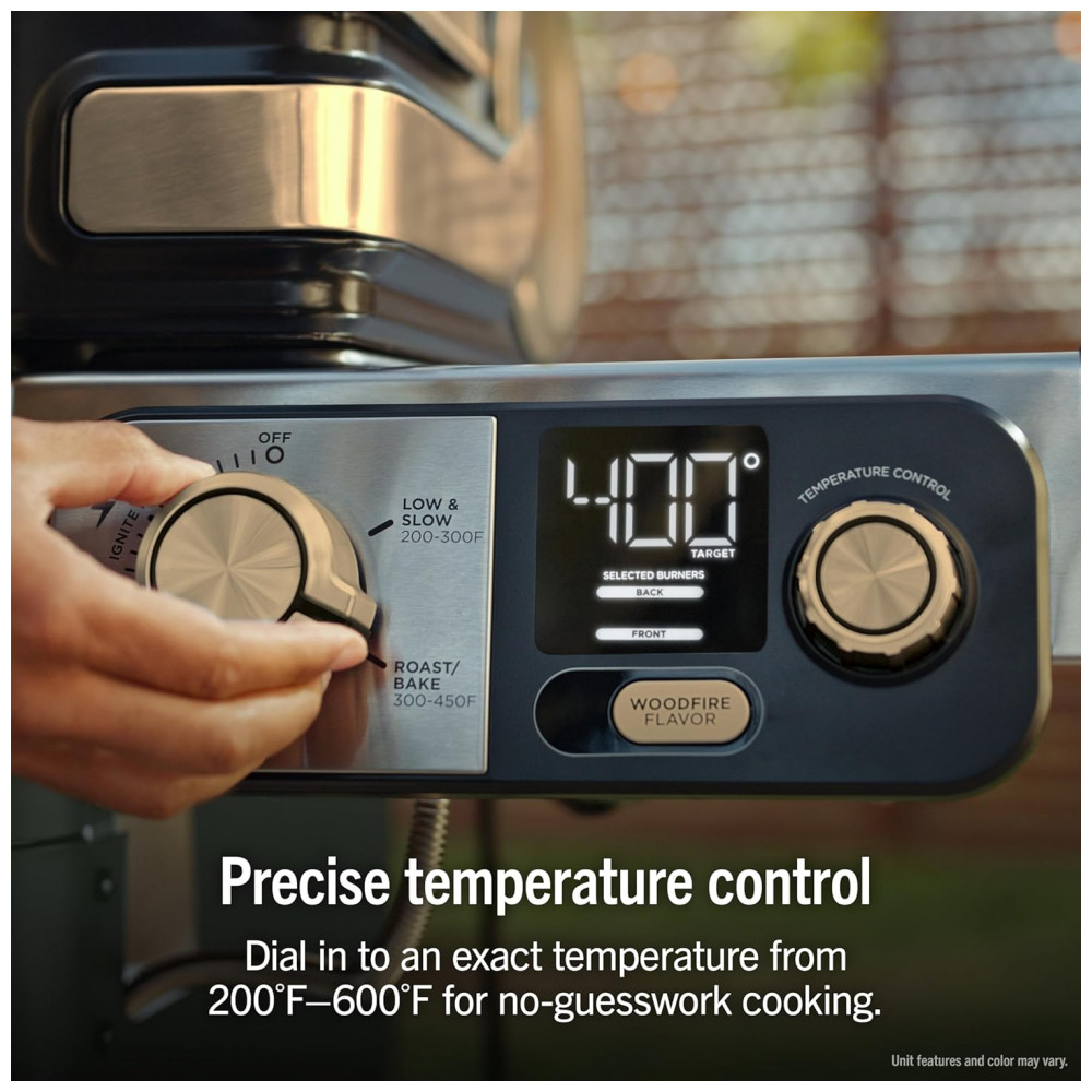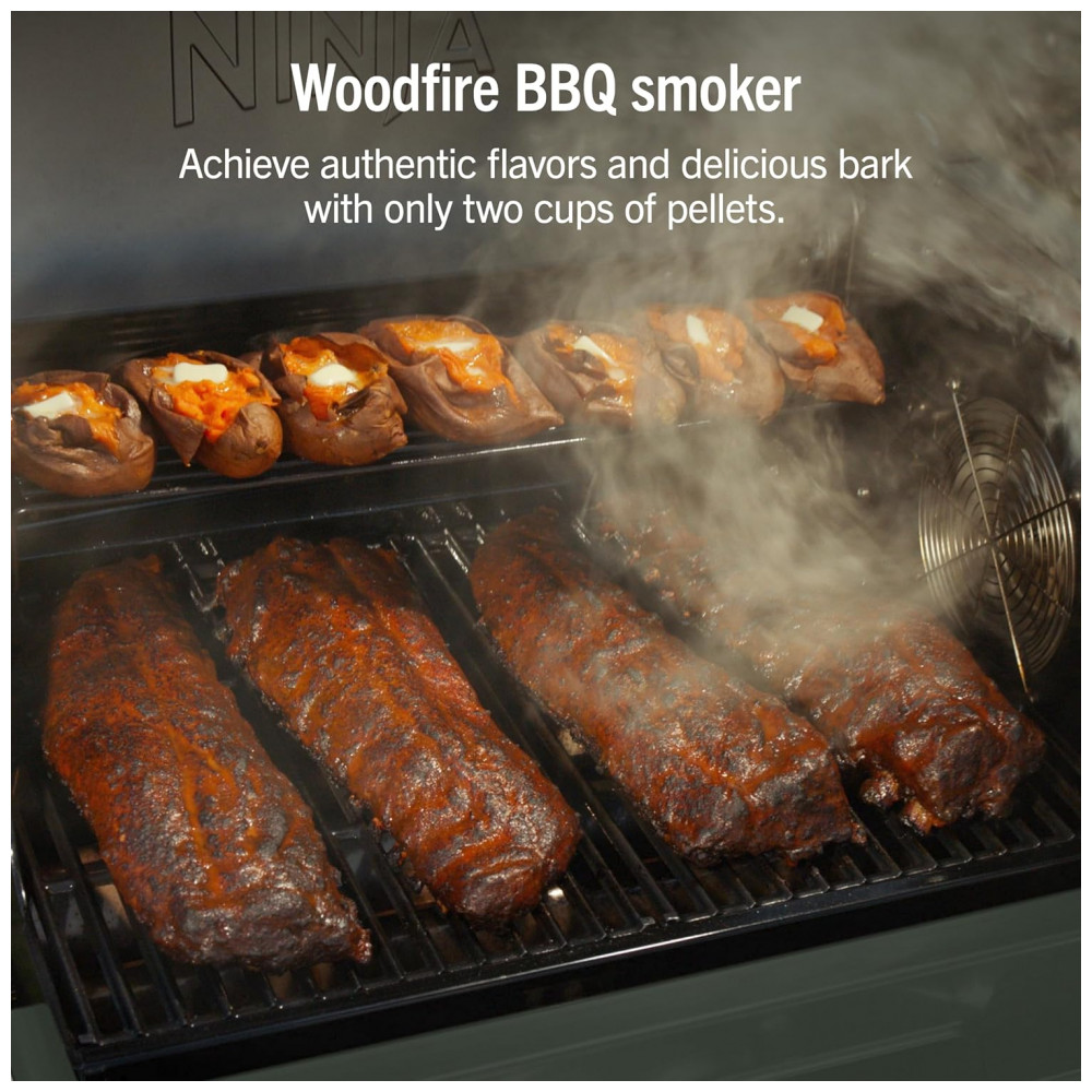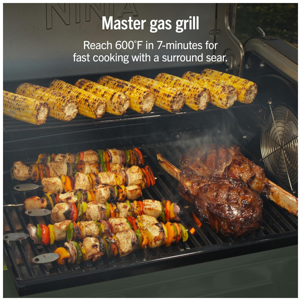 A churrasqueira Ninja FlexFlame é um sistema de cocção externa 5 em 1 que permite grelhar, defumar, assar, usar chapa (griddle) e preparar pizzas no mesmo equipamento. A combinação de queimadores a gás propano com controle eletrônico alimentado por energia elétrica oferece ajuste preciso de temperatura em ampla faixa, adequada tanto para selagens em alta temperatura quanto para defumação em baixa cocção.