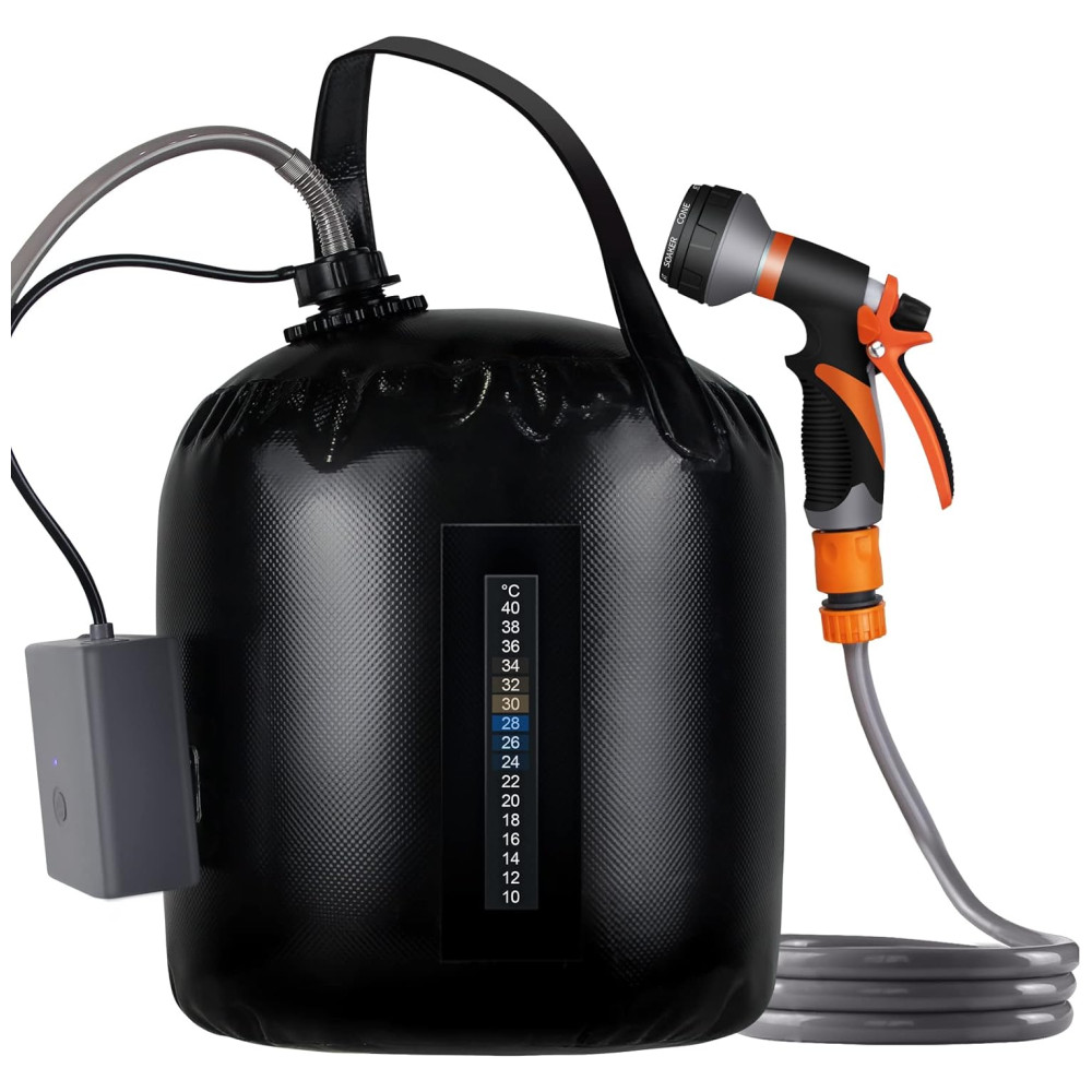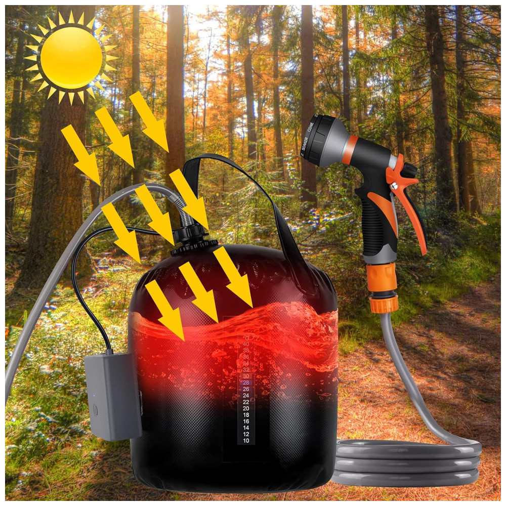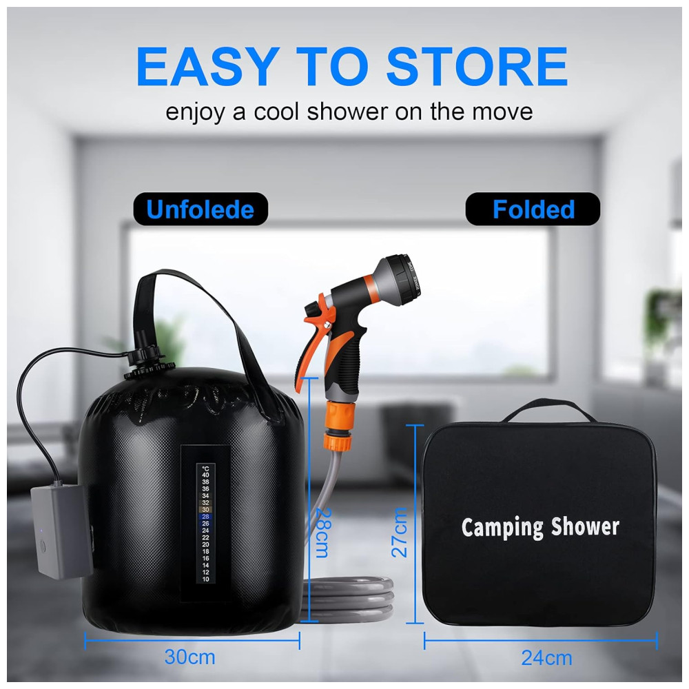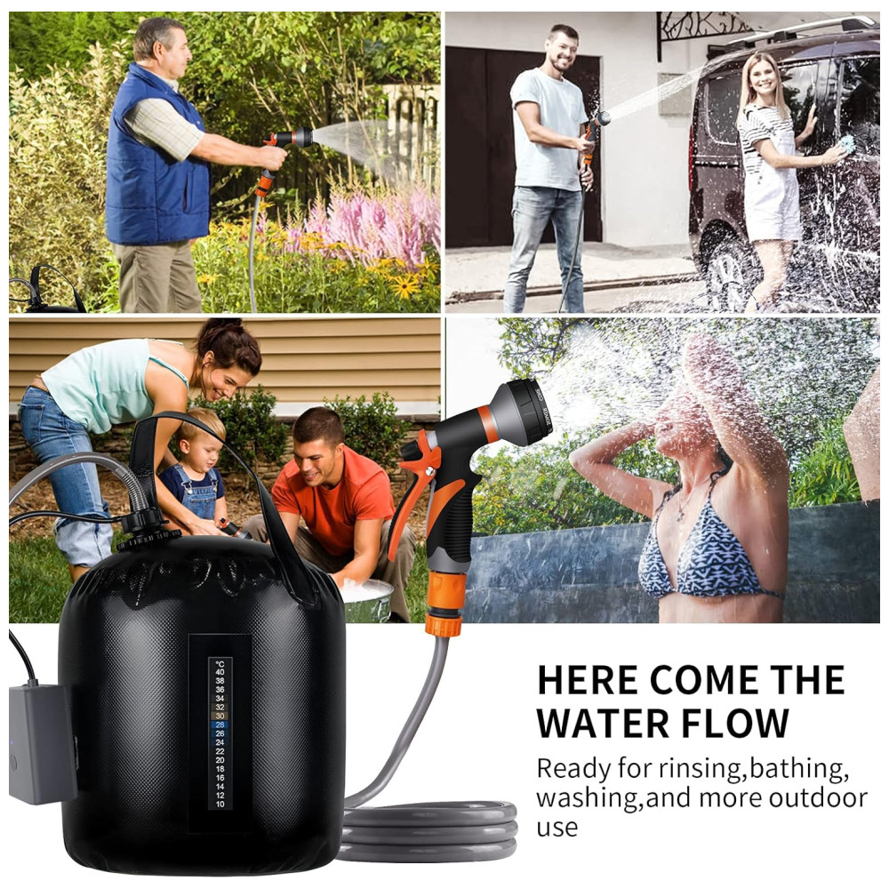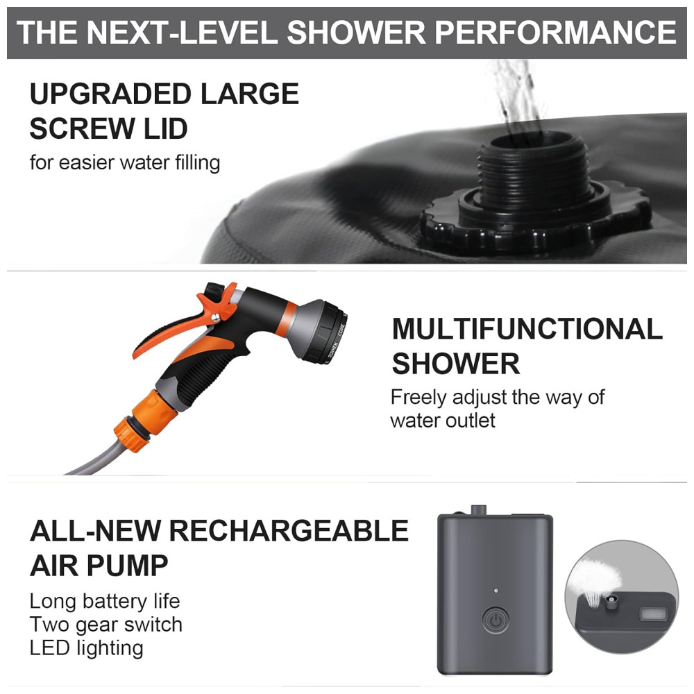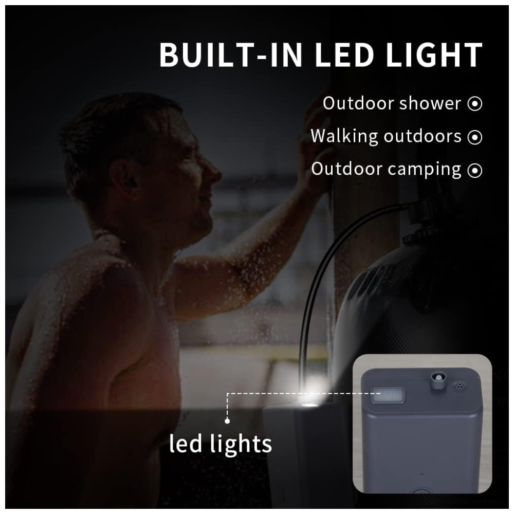 Acessório perfeito para camping e caminhadas pequeno chuveiro portátil embala facilmente na bagagem, mochila ou porta malas do carro para caminhadas, camping e limpeza de animais de estimação. Adequado para banhos internos, externos, acampamentos, churrascos, caminhadas, viagens, banhos de crianças, limpeza de animais de estimação, lavagem de carros e rega de jardins.