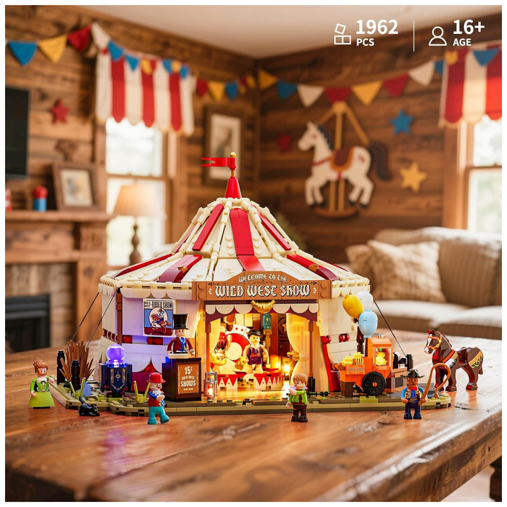 O design modular sobre terreno rústico ocidental oferece roda de facas giratória, trapézio oscilante, carrinho de pipoca móvel e acessórios temáticos para seis minifiguras exclusivas de artistas circenses, ampliando interatividade e narrativa.