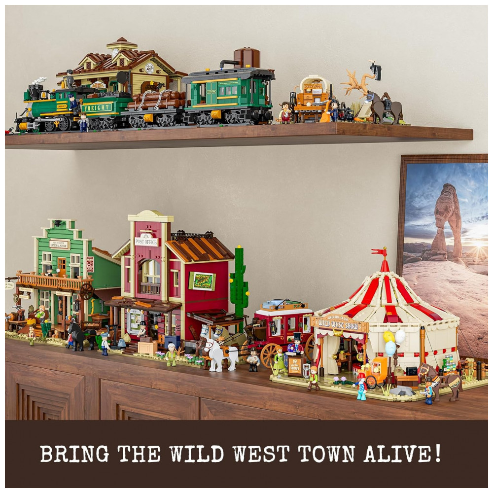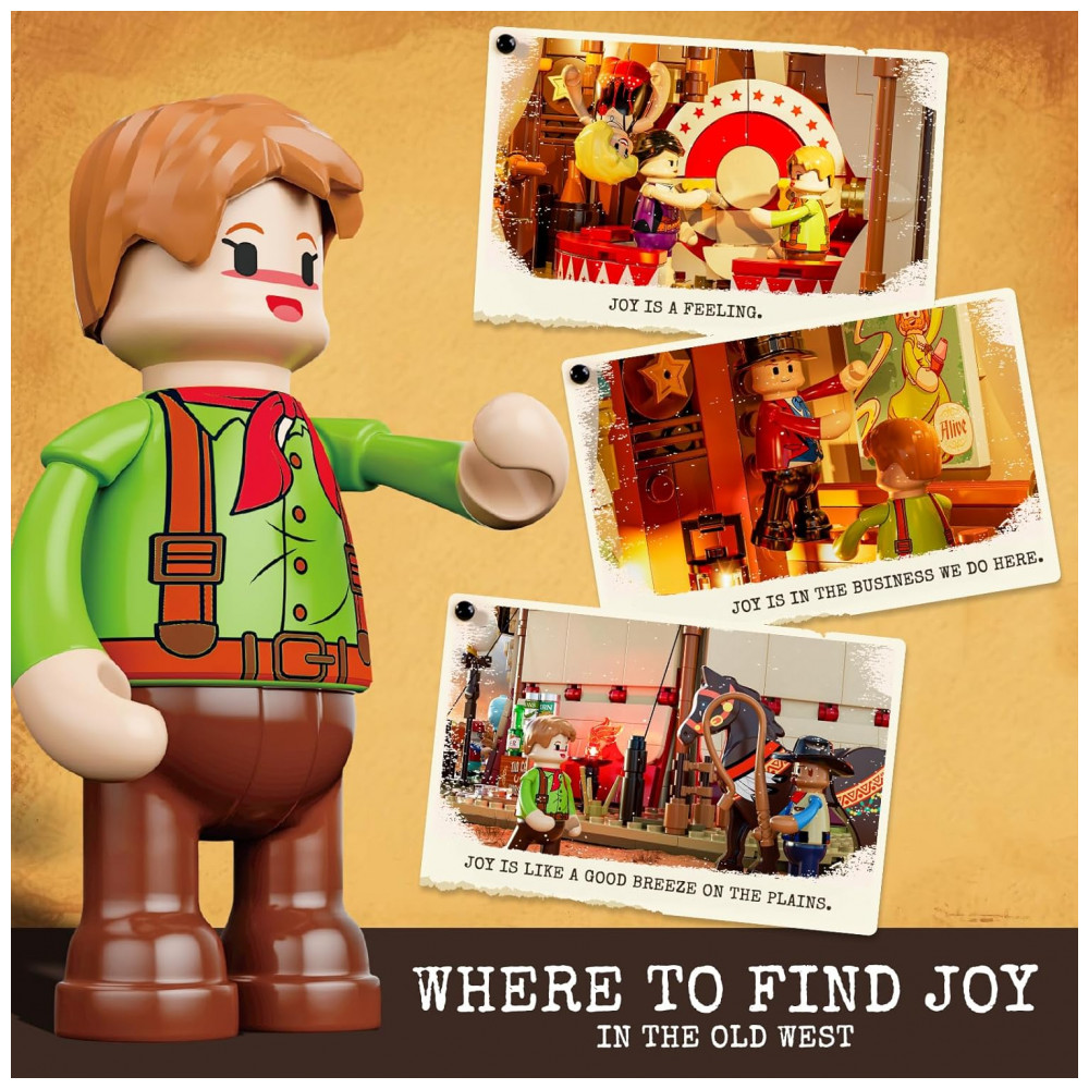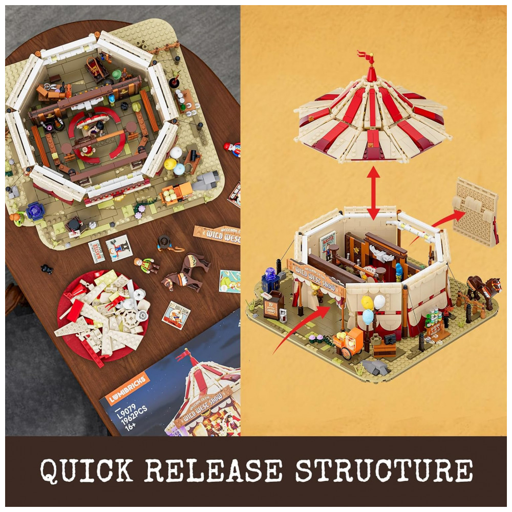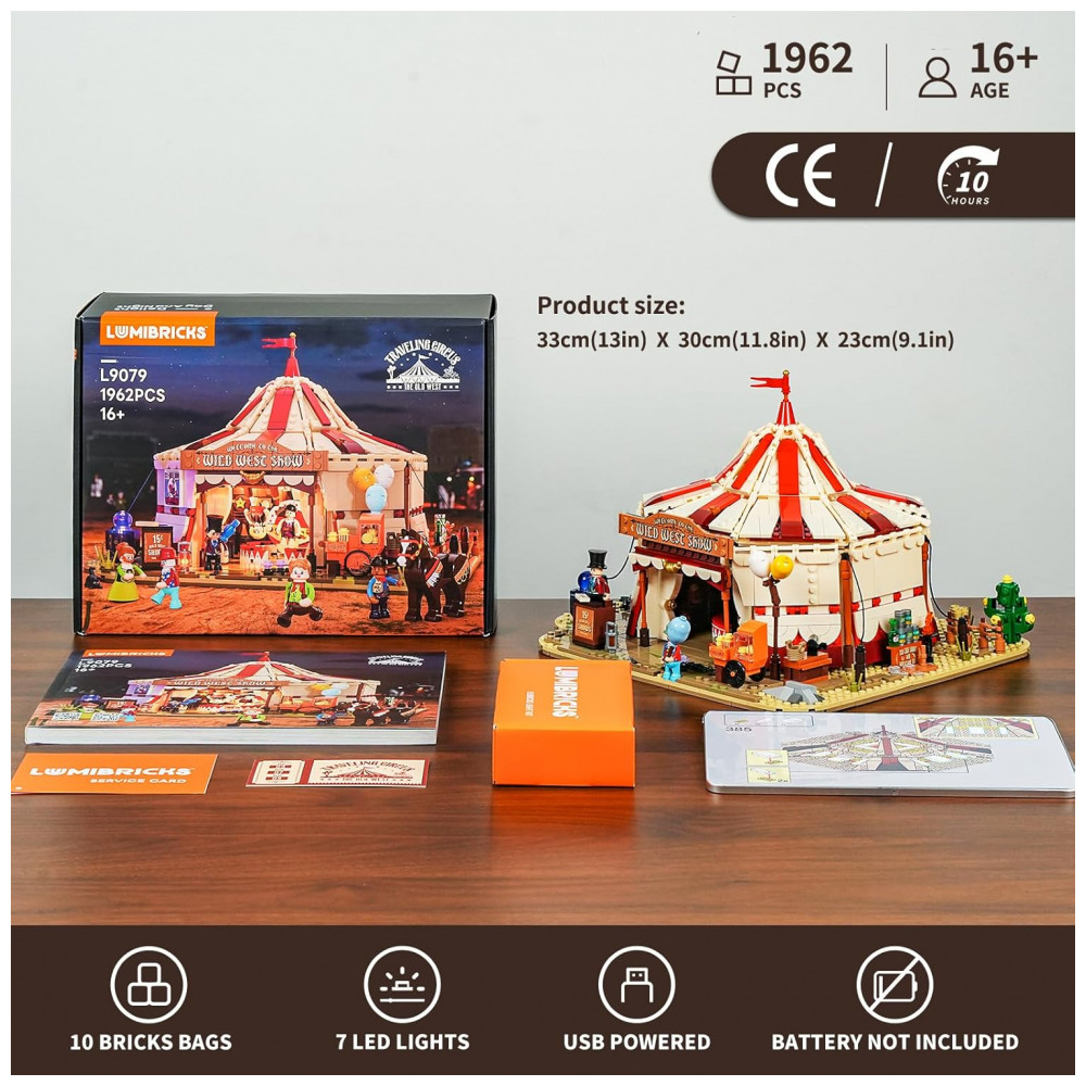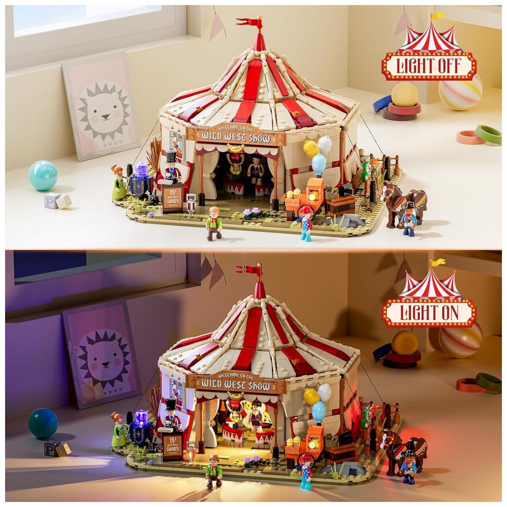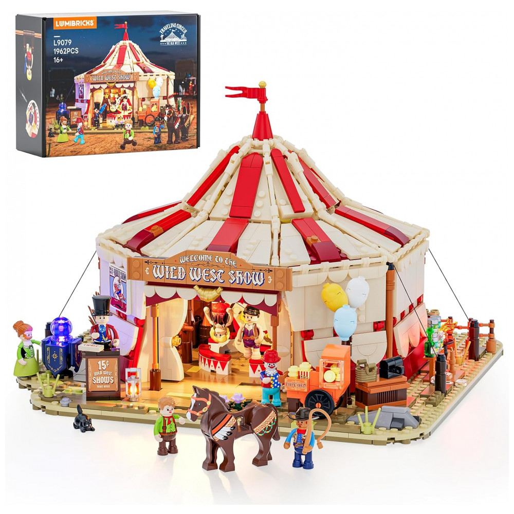 O kit Lumibricks Circo Viajante Wild West Show contém 1962 peças plásticas ABS que formam uma tenda circense temática do Oeste Selvagem com sete pontos de iluminação LED integrados, incluindo luz misteriosa na barraca da adivinhação, holofotes de palco e iluminação interna quente nos bastidores, criando efeitos visuais dinâmicos para exibição noturna.