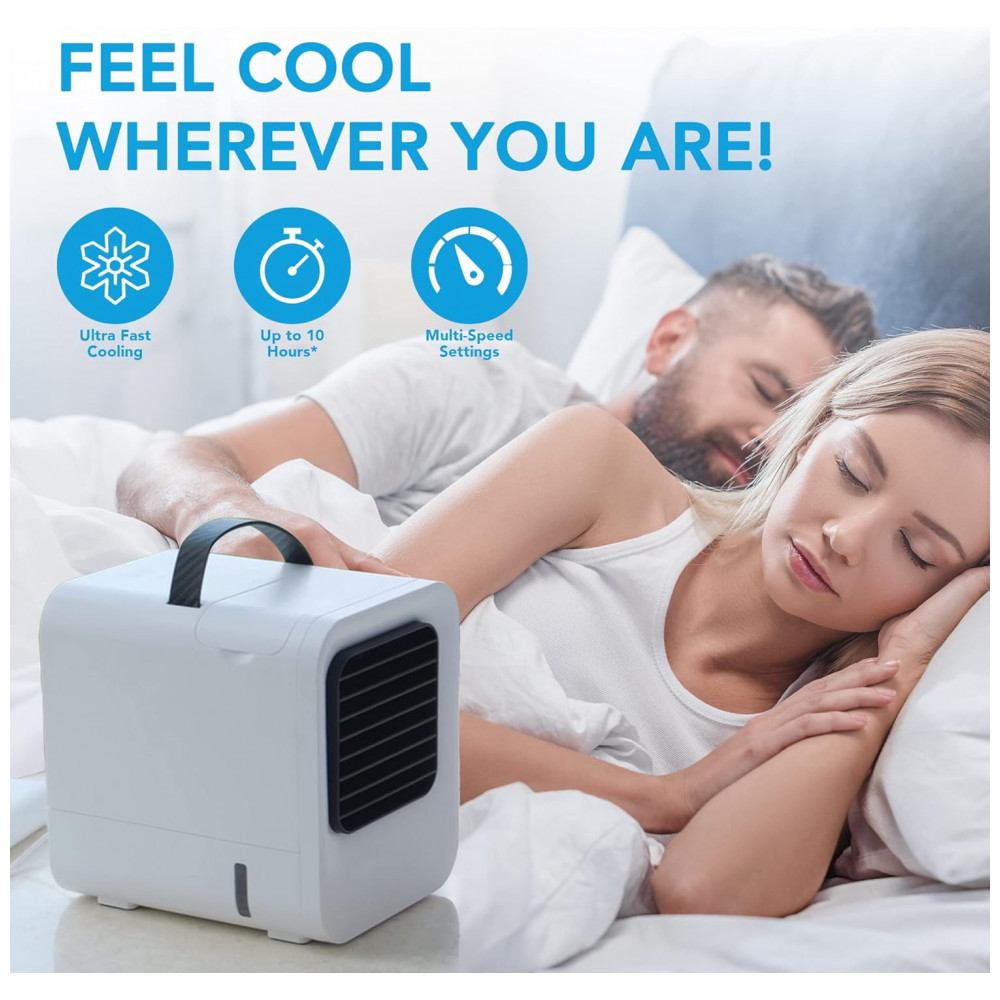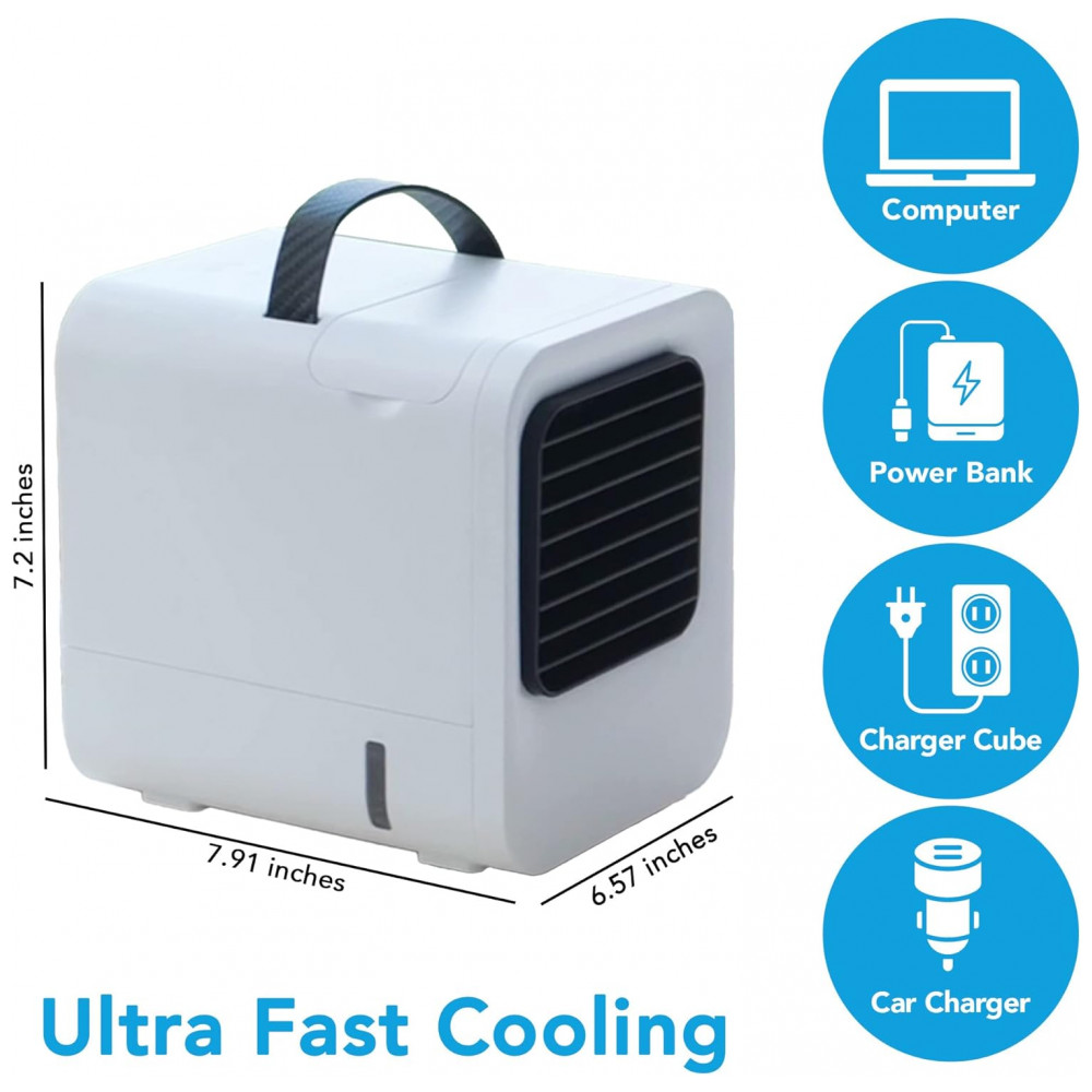 Perfeito para espaços pequenos Com uma aparência limpa e design compacto, este ar condicionado portátil é perfeito para adicionar à sua mesa de escritório, mesa de cabeceira, balcão da cozinha ou trazer o carro, acampar em uma barraca, galpão de ferramentas, garagem e muito mais Com um design leve, você pode carregá lo com você em qualquer lugar.