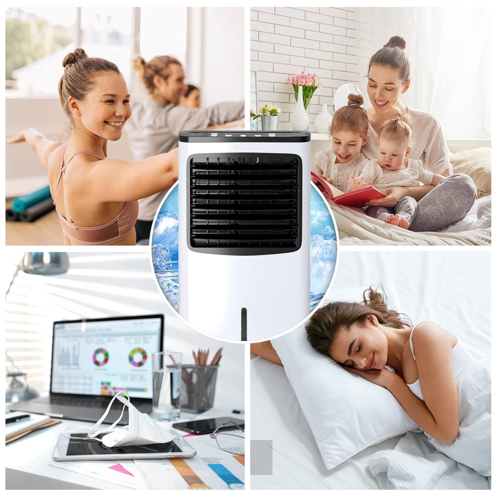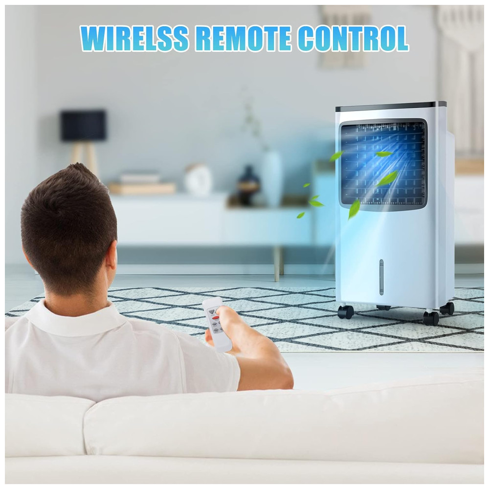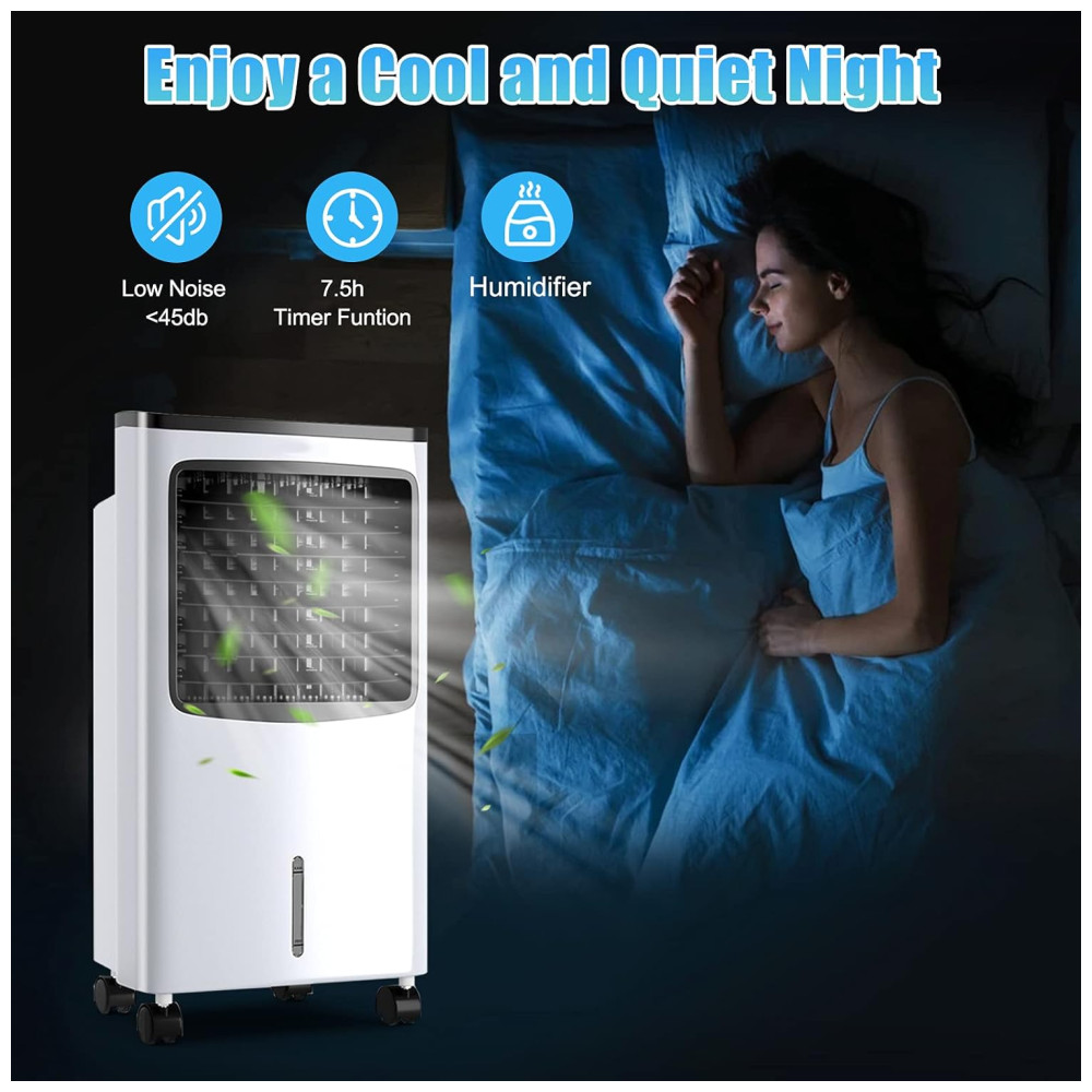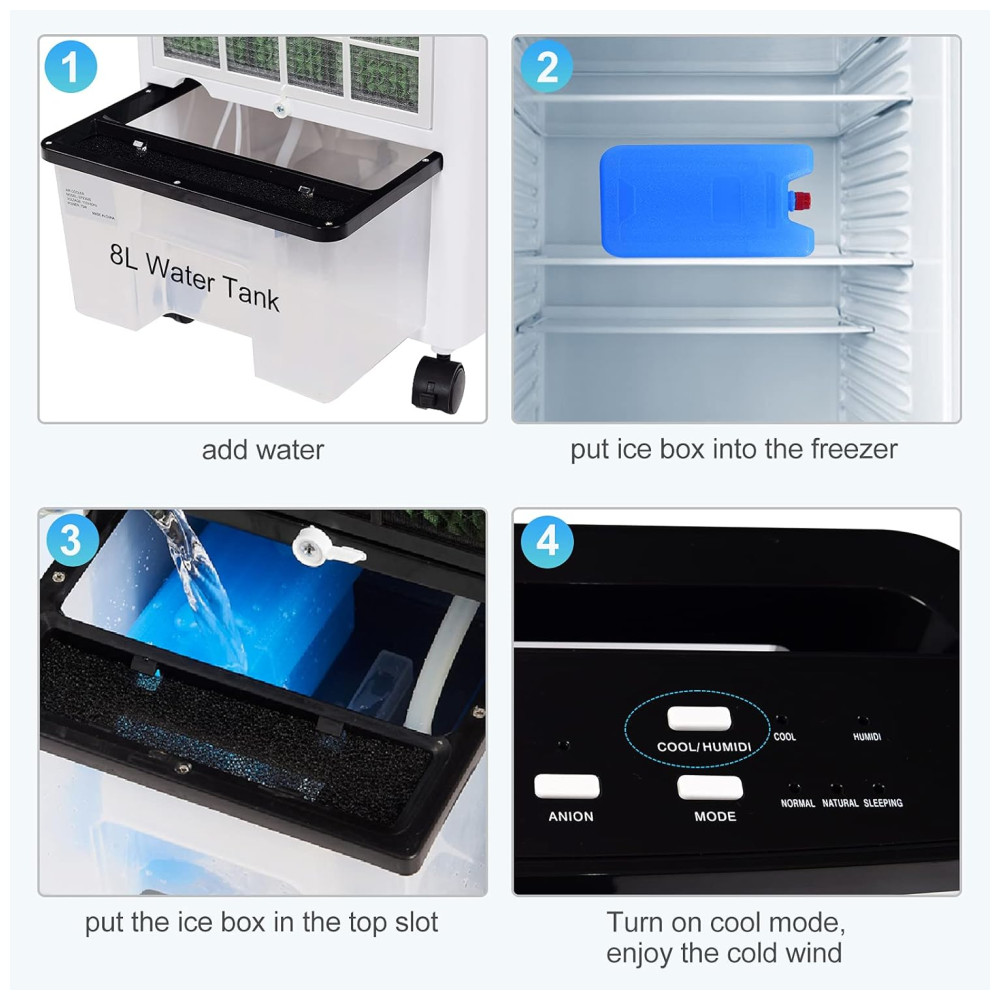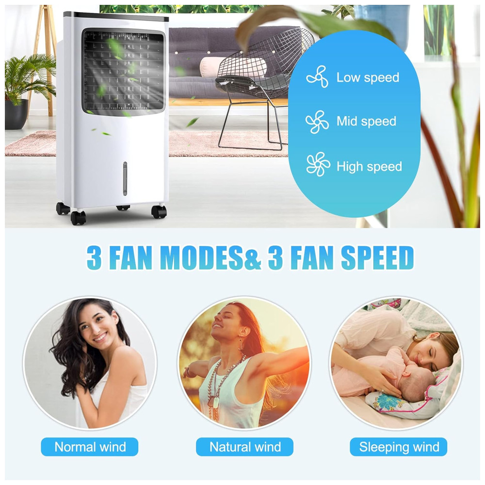 Existem 3 modos e 3 velocidades Existem 3 velocidades que podem ser ajustadas para controlar a velocidade do refrigerador de ar para que você possa escolher o melhor conforto. É dividido em vento padrão, vento natural e vento sono, você pode ajustá lo livremente de acordo com suas necessidades. Além disso, nosso refrigerador de ar também pode fornecer fluxo de ar de resfriamento e vapor de água para ajudá lo a melhorar o fluxo de ar da sala e aumentar a umidade do ar, reduzindo assim o consumo de energia e os custos. Fácil de mover e transportar, economiza espaço O produto é pequeno e requintado, o tamanho é de apenas 38 28,5 , economiza muito espaço na sala e o ventilador de ar condicionado tem uma alça embutida e um desenho de roda universal na parte inferior. O árduo esforço permite mover o ventilador do ar condicionado de uma sala para outra. Operação fácil e conveniente O ventilador do ar condicionado tem um display LED, que pode exibir a temperatura com precisão. O produto também possui controle remoto e função de temporizador de 7,5 horas. Quer esteja na sala de estudos, no sofá ou na cama, pode desfrutar do vento fresco livremente sem se levantar. O ventilador de ar condicionado pode trazer um efeito de dissipação de calor duradouro. Configuração do tanque de água grande de 8L, para que você possa evitar o problema de adicionar água frequentemente Equipado com tanque de água grande de 8L, pode ser como umidificador e ventilador de ar condicionado. O projeto do tanque de água pode fornecer fluxo de ar de resfriamento e vapor de água para resfriar a sala e aumentar a umidade. Pode se ver que o tanque de água de grande capacidade de 8L no nível da água reduz o problema de adição frequente de água e proporciona uma boa experiência de compra. Sistema de resfriamento rápido, segurança e proteção ambiental O resfriador de ar evaporativo não tem compressor, não usa refrigerantes químicos e é e ecologicamente correto. O produto possui um poderoso sistema de refrigeração. Você só precisa adicionar água à pia, colocar a caixa de cristal de gelo cheia de água na geladeira, colocar a caixa de cristal de gelo no tanque de água e pressionar o botão de modo de resfriamento para resfriar o ambiente.