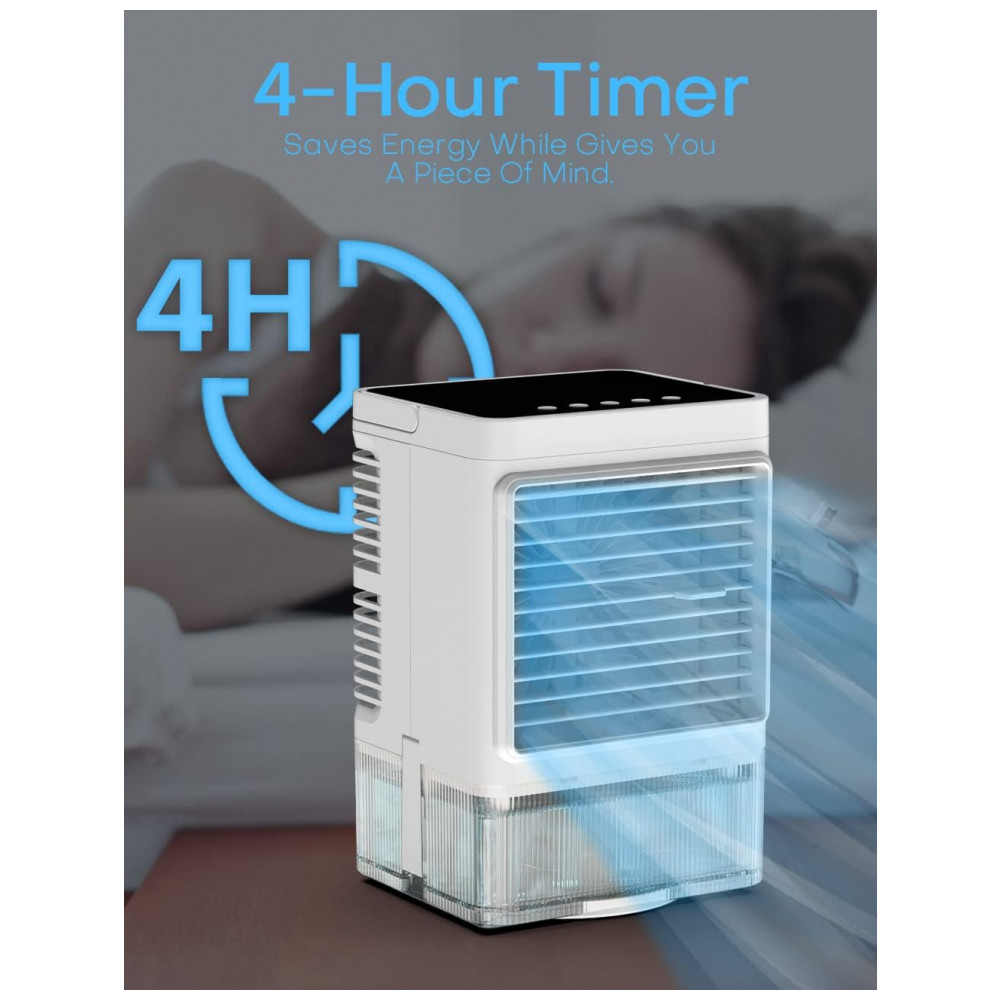 Recurso conveniente de temporizador e resfriamento sem ruído O mini refrigerador de ar evaporativo está equipado com uma função de temporizador 4H, que garante que você não desperdice energia ou esqueça de desligá lo antes de sair de casa. E com um nível de ruído abaixo de 40 decibéis, você pode aproveitar a brisa fresca sem distrações irritantes.