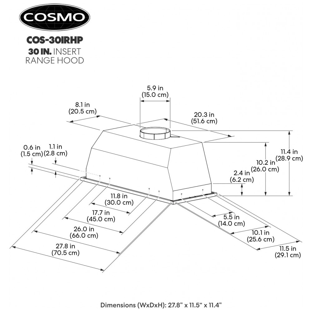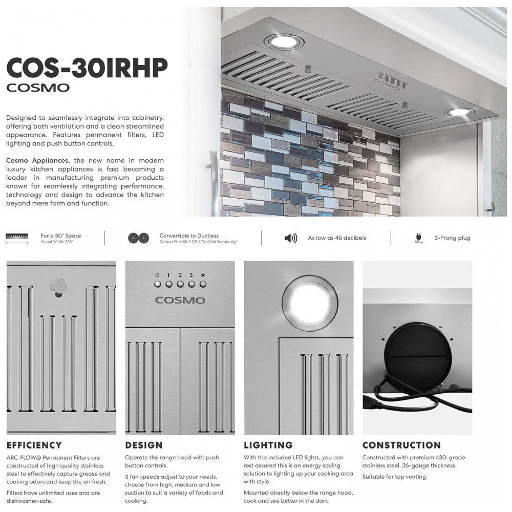 A coifa de embutir COSMO COS-30IRHP é indicada para instalação em módulos de armário ou estruturas personalizadas sobre fogão ou cooktop, ficando integrada ao gabinete com apenas a base voltada para a área de cocção. O corpo em aço inoxidável escovado é projetado para suportar o uso doméstico com exposição a vapor, gordura e óleo, mantendo acabamento compatível com outros eletrodomésticos em inox.