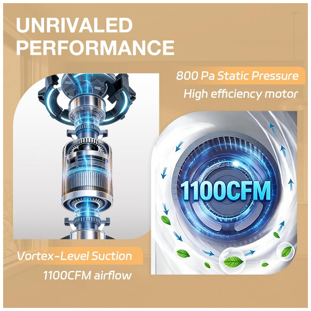 Recursos e tecnologias: Motor brushless de alta eficiência, controle eletrônico por toque, função de desligamento com atraso, sistema CleanAir com filtragem de carvão ativado, operação em modo duto ou recirculante, iluminação LED