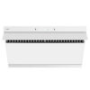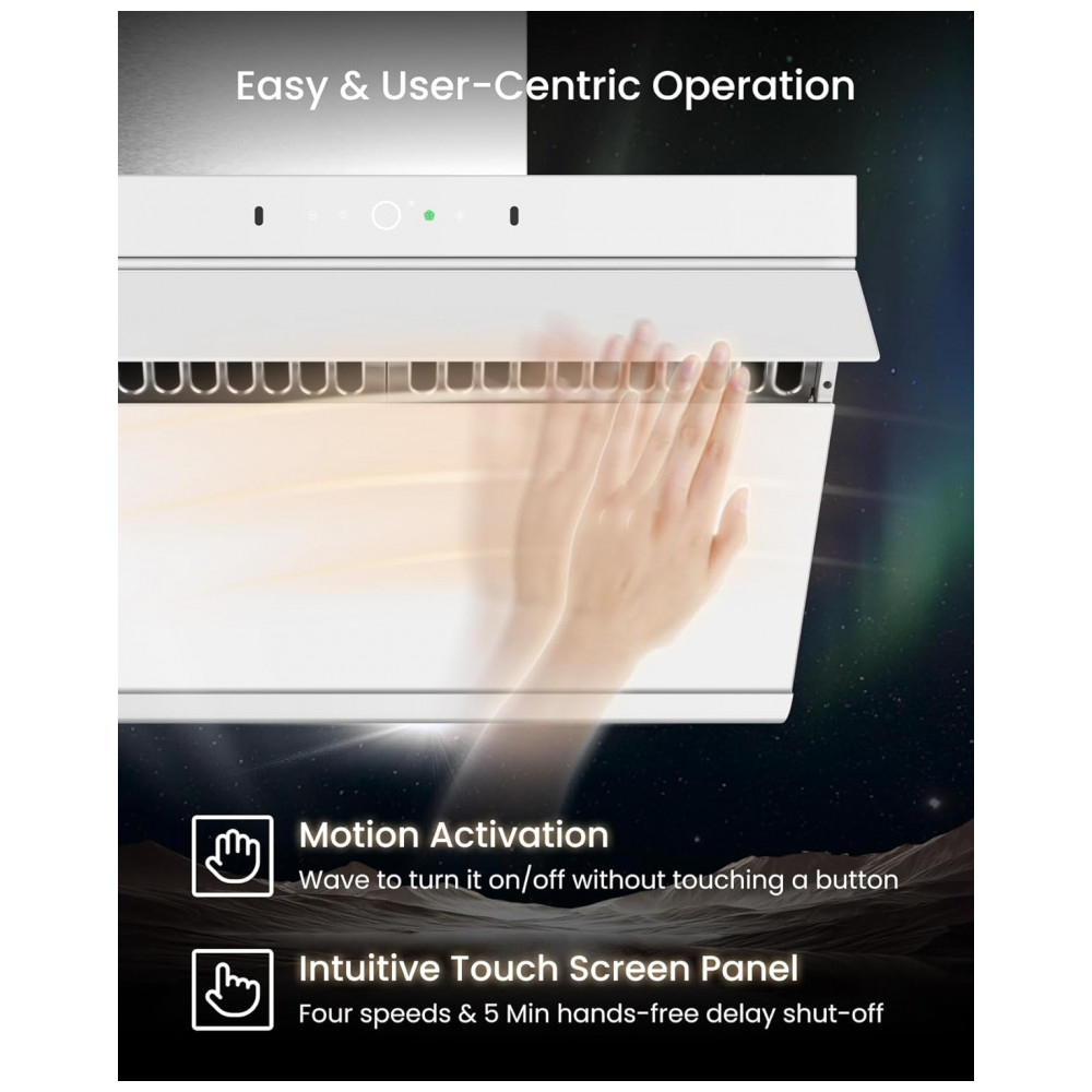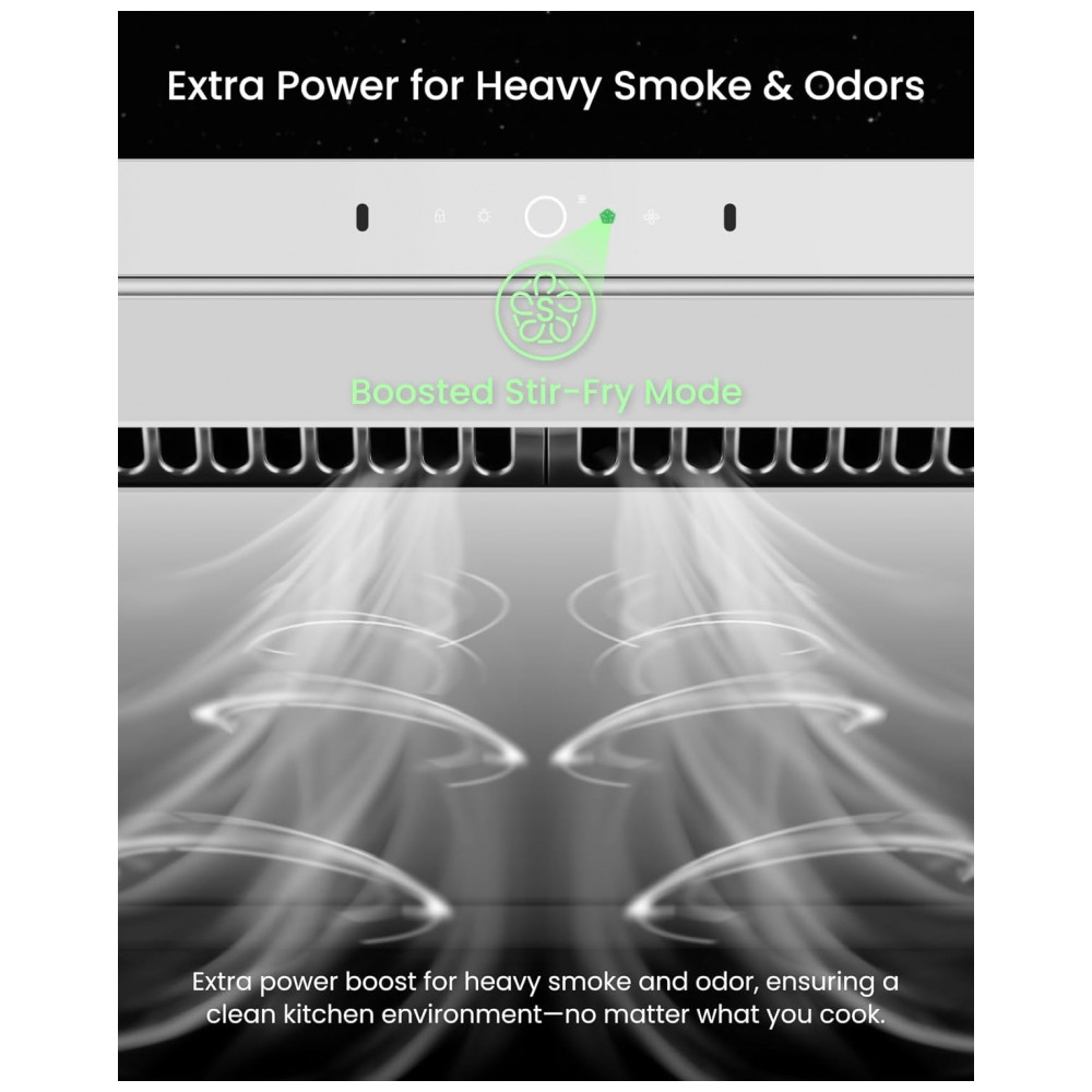 O sistema de ventilação emprega dois motores DC com vazão equivalente de 1100 CFM e pressão estática máxima de 540 Pa, dimensionado para remoção de fumaça, gordura e odores em diferentes níveis de preparo. A coifa oferece quatro velocidades de operação, incluindo modo para frituras com reforço de potência, comandadas por painel touch e por sensor de movimento, permitindo acionar e ajustar a exaustão por gestos sem contato direto com o painel.