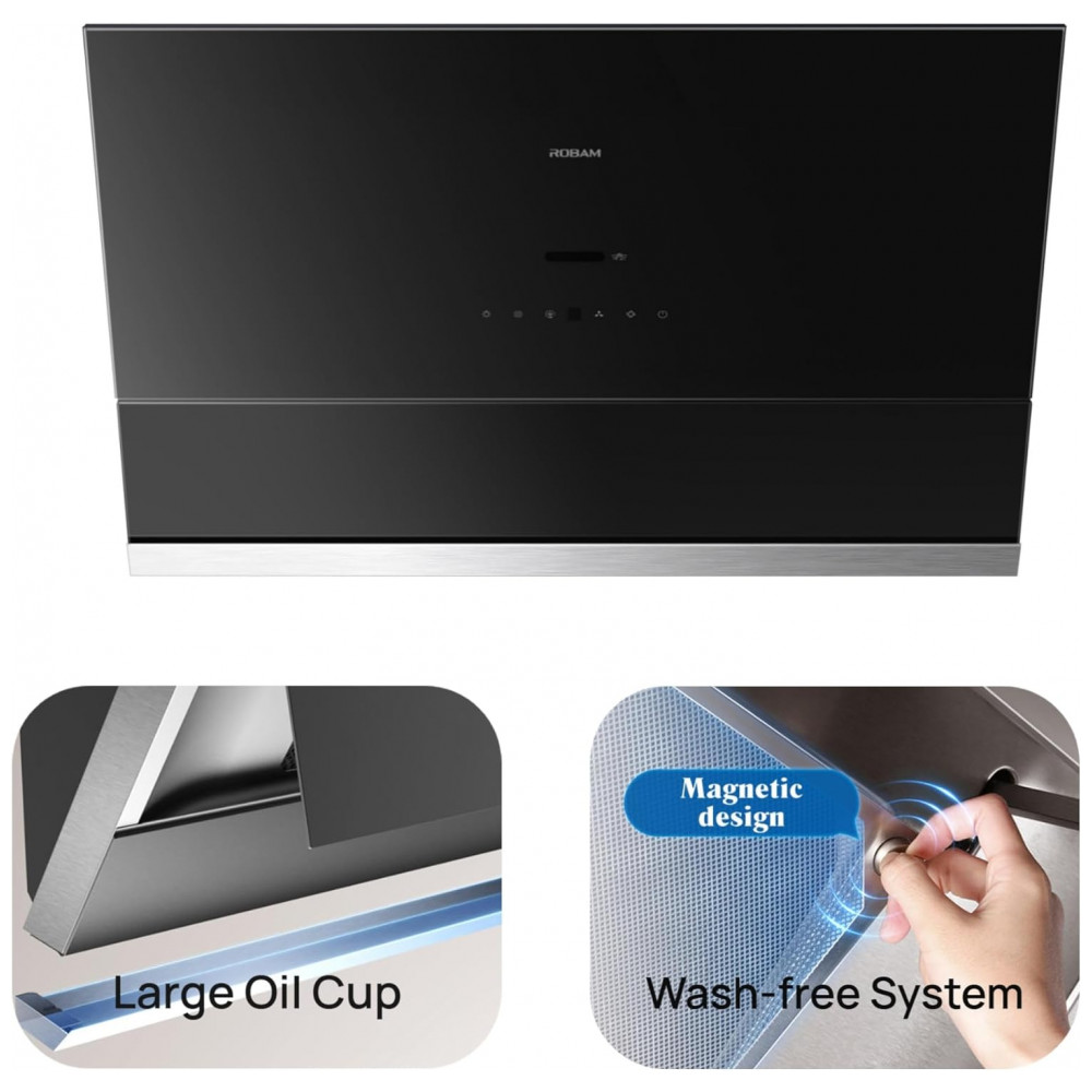 Recursos e tecnologias: Motor BLDC, controle por gestos, painel touch, ajuste automático de velocidade, revestimento nano resistente a manchas e impressões digitais, ampla zona de contenção em aço inox, coletor de óleo de grande capacidade, iluminação LED, sincronização R-Link com cooktop compatível, lembrete de limpeza e bloqueio de tela para higienização