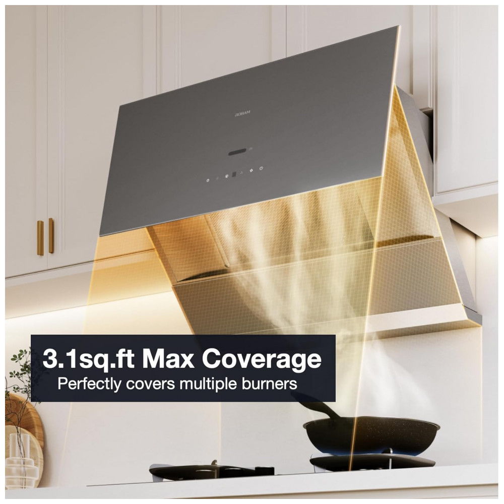 O sistema de ventilação utiliza motor BLDC brushless com vazão máxima de 1200 CFM e pressão estática de 1000 Pa, dimensionado para remoção de fumaça, gordura e odores em preparos de alta intensidade. A coifa oferece nove velocidades de operação com controle por painel touch e gestos, além de ajuste automático de velocidade que compensa a resistência do duto para manter o desempenho de sucção próximo ao ideal.