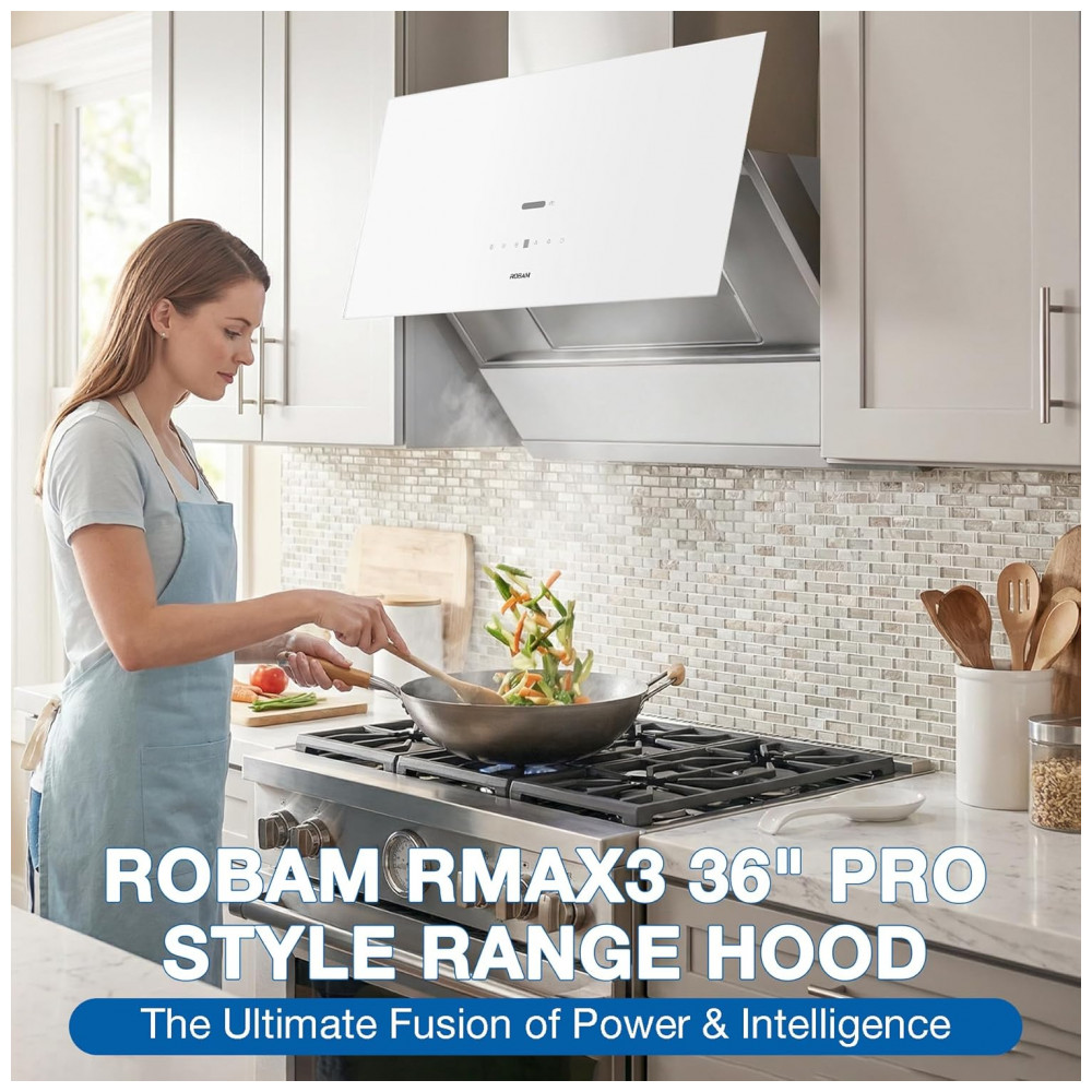 A coifa de embutir sob armário ou de parede Robam de 91 cm na cor branca é indicada para cozinhas residenciais com fogões de 36 polegadas, oferecendo exaustão de alta capacidade em sistemas com duto. O equipamento combina corpo em aço inoxidável com frente em vidro temperado, formando área ampla de captura de fumaça para uso em cozinhas de médio e grande porte.