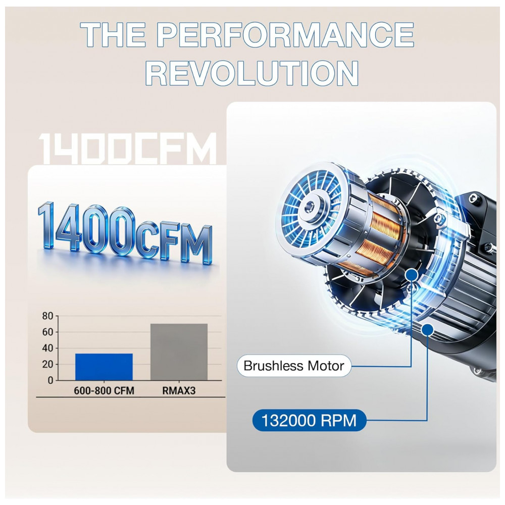 O sistema de ventilação utiliza motor brushless de alta eficiência com vazão de 1400 CFM e pressão estática de 1000 Pa, dimensionado para remoção intensa de fumaça, gordura e vapores em preparos de maior carga térmica. A coifa dispõe de nove velocidades de operação, com controle por toque e por gestos, permitindo ajustar o fluxo de ar de forma gradativa de acordo com a necessidade de ventilação.