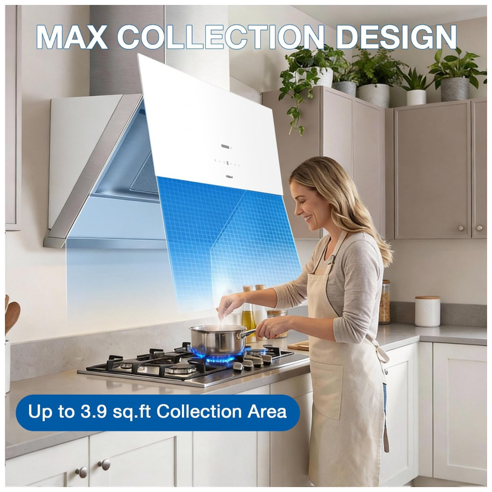 O desenho de captação utiliza área de tela de aproximadamente 0,36 m², posicionada próxima aos queimadores para interceptar fumaça e vapores em toda a largura do fogão. A estrutura em aço inox escovado com vidro temperado e acabamento frontal em preto no painel confere aspecto técnico, além de permitir limpeza externa com pano macio, água e sabão neutro.
