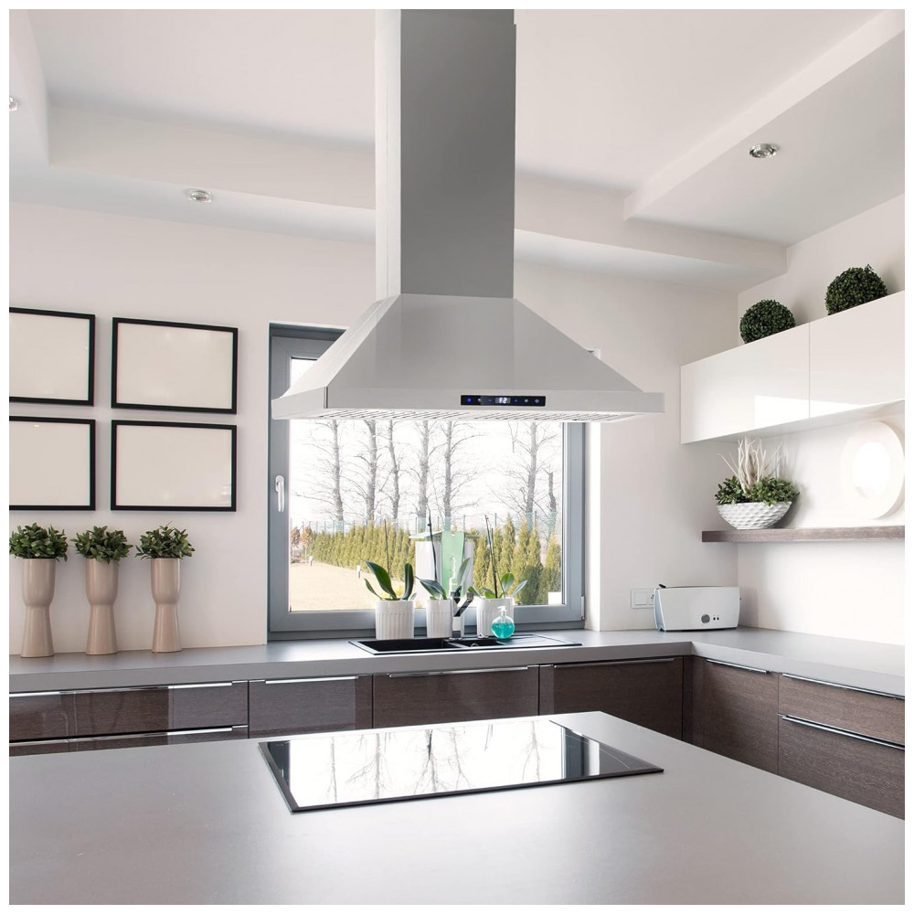 Uso indicado: Cozinha residencial com instalação em ilha sobre fogão ou cooktop em modo exaustor ou depurador