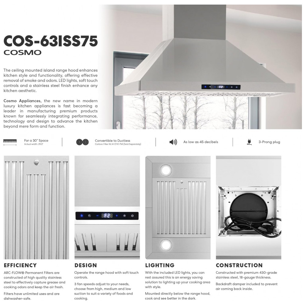 A coifa de ilha COSMO COS-63ISS75 é indicada para instalação em teto sobre ilhas de cocção em cozinhas residenciais, operando em modo exaustor com saída superior para duto circular de 15 cm ou em modo depurador com uso de kit de filtro de carvão ativado compatível. A construção em aço inoxidável 430 escovado com filtros permanentes tipo baffle foi projetada para captar fumaça, vapores de gordura e odores gerados durante o preparo dos alimentos na área central da cozinha.