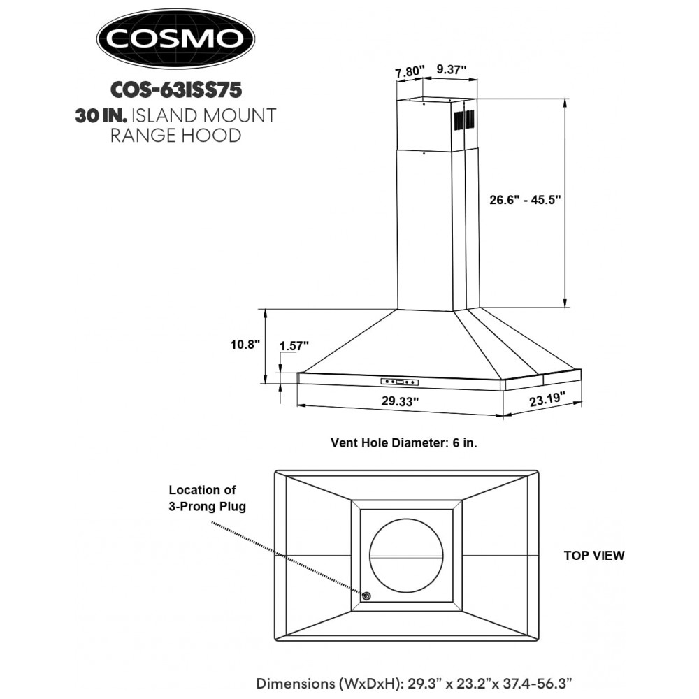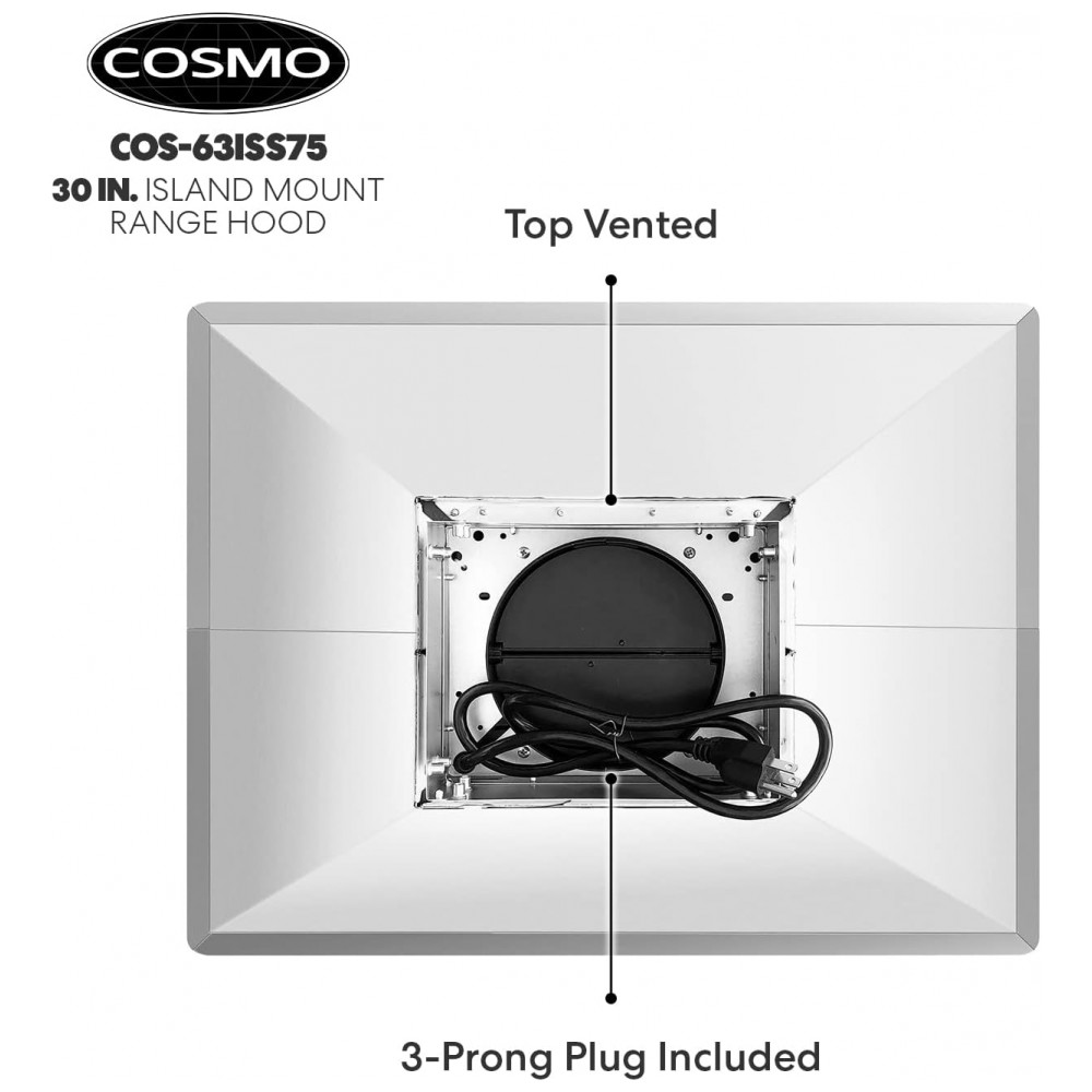 Conteúdo da embalagem: Coifa de ilha COS-63ISS75 filtros permanentes em aço inox kit de instalação e fixação coluna/chaminé de teto LEDs instalados cabo de alimentação com plugue de 3 pinos manual do usuário