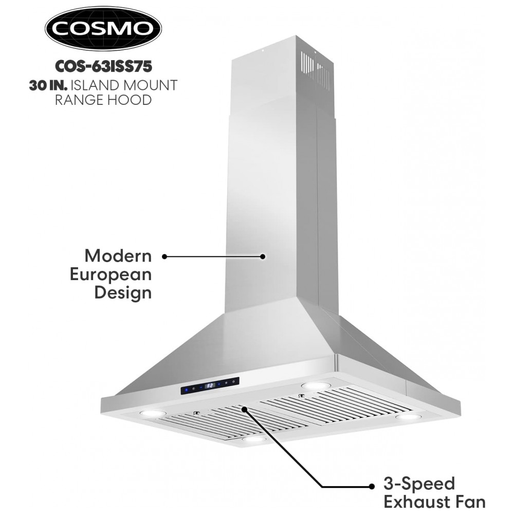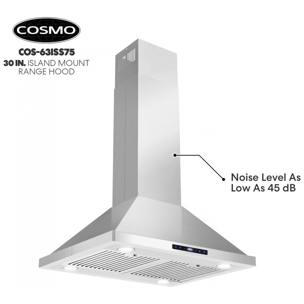 Coifa de ilha 76cm COSMO inox escovado 646 m³/h comando touch filtros permanentes LED 110V