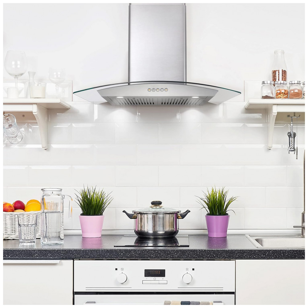 Coifa de parede 76cm COSMO inox escovado vidro curvo 646 m³/h comando por botão filtros permanentes LED 110V