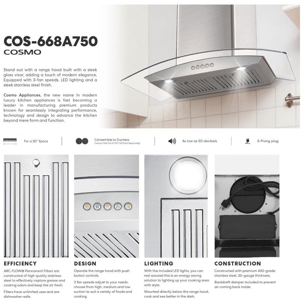 A coifa de parede COSMO COS-668A750 é indicada para instalação sobre fogão ou cooktop em cozinhas residenciais, com chaminé telescópica e saída superior para duto circular de 15 cm em configuração exaustora, com possibilidade de conversão para modo depurador por meio de filtro de carvão ativado compatível. A estrutura utiliza corpo em aço inoxidável escovado de grau 430 e visor em vidro temperado curvo, dimensionados para captar fumaça, vapores de gordura e odores na área de cocção.