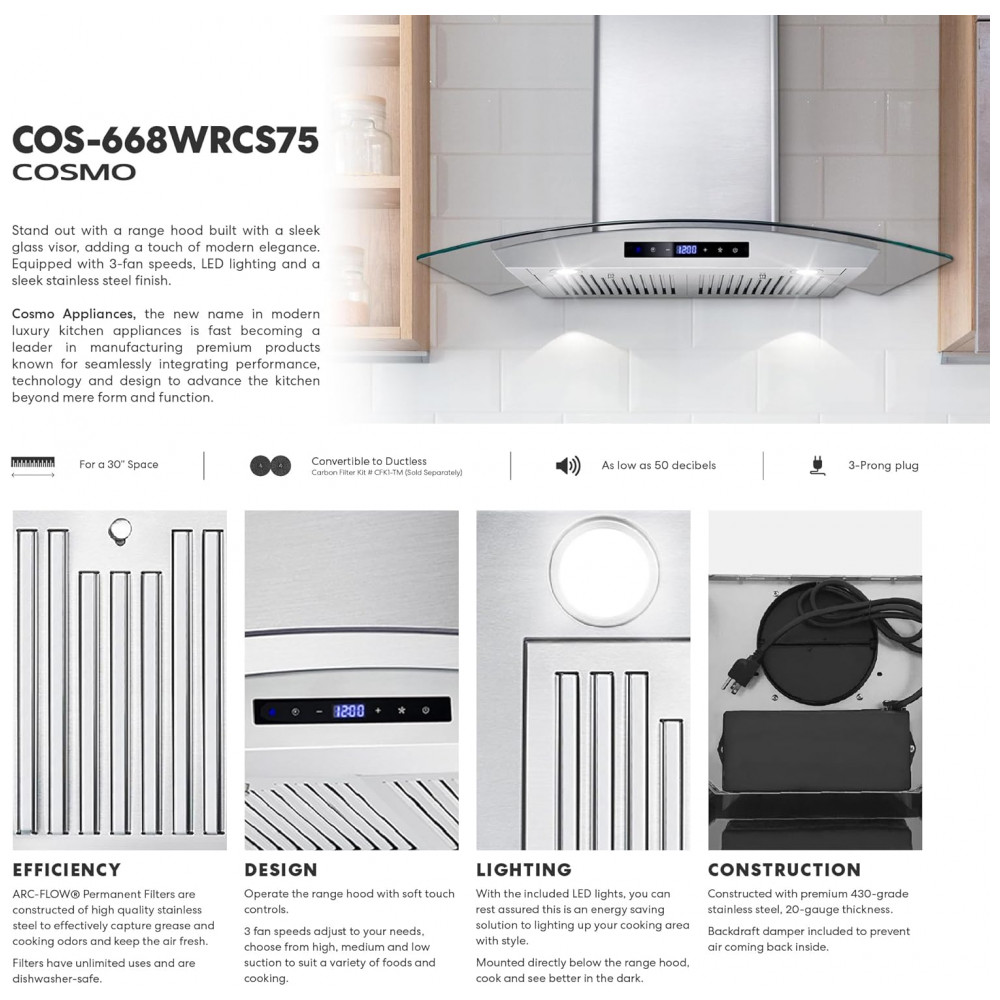 A coifa de parede COSMO COS-668WRCS75 é indicada para instalação em parede sobre fogão ou cooktop, com chaminé telescópica e saída superior para duto de 15 cm, permitindo uso em modo exaustor ou conversão para modo depurador com filtro de carvão ativado específico. O conjunto utiliza corpo em aço inoxidável escovado combinado a canopy de vidro temperado curvo, adequado para cozinhas residenciais que exigem extração de fumaça, vapores de gordura e odores na área de cocção.