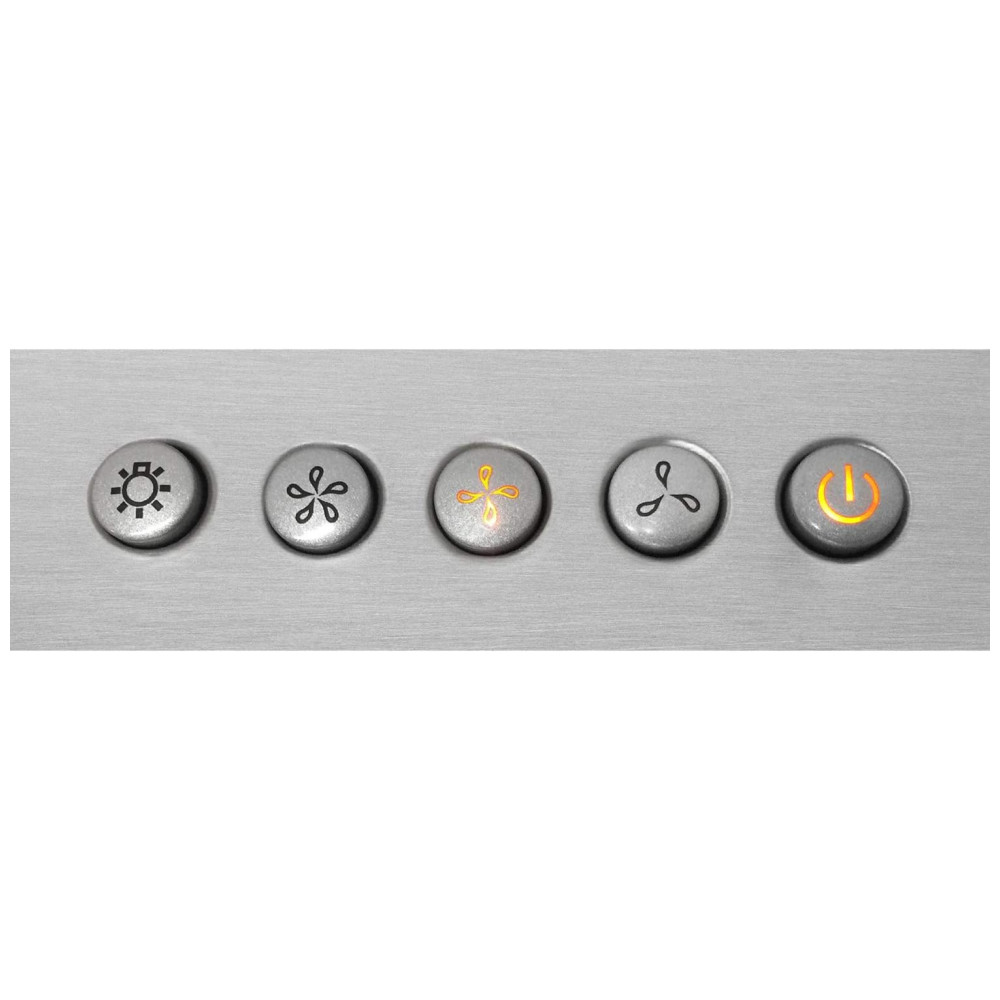 O painel frontal integra comandos por botão para acionamento do equipamento, seleção das três velocidades do ventilador e controle da iluminação, concentrando as funções principais em interface de operação simples. A iluminação inferior é composta por duas lâmpadas LED frontais de 2 W, posicionadas na base da coifa para fornecer luz branca direta sobre o fogão ou cooktop, favorecendo a visualização da superfície de cocção.