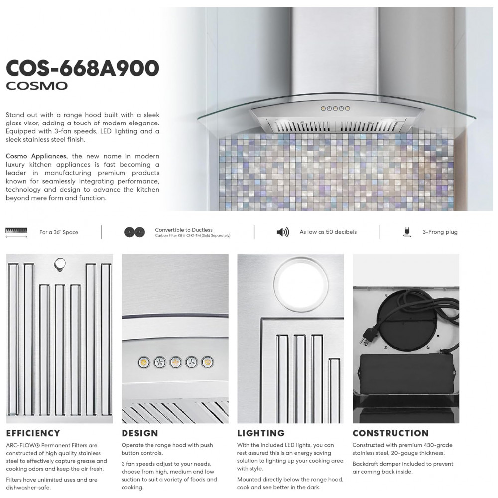 A coifa de parede COSMO COS-668A900 é destinada à instalação em parede sobre fogão ou cooktop, com chaminé telescópica e saída superior para duto circular de 15 cm em configuração exaustora, podendo operar também em modo depurador mediante uso de filtro de carvão ativado compatível. A estrutura utiliza aço inoxidável escovado de grau 430 com visor em vidro temperado curvo, projetados para captar vapores de gordura, fumaça e odores na área de cocção em cozinhas residenciais.