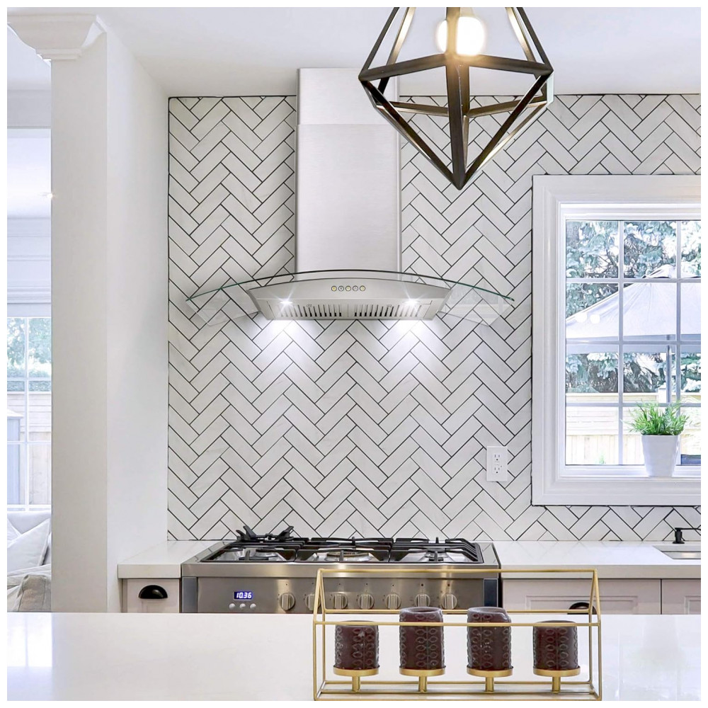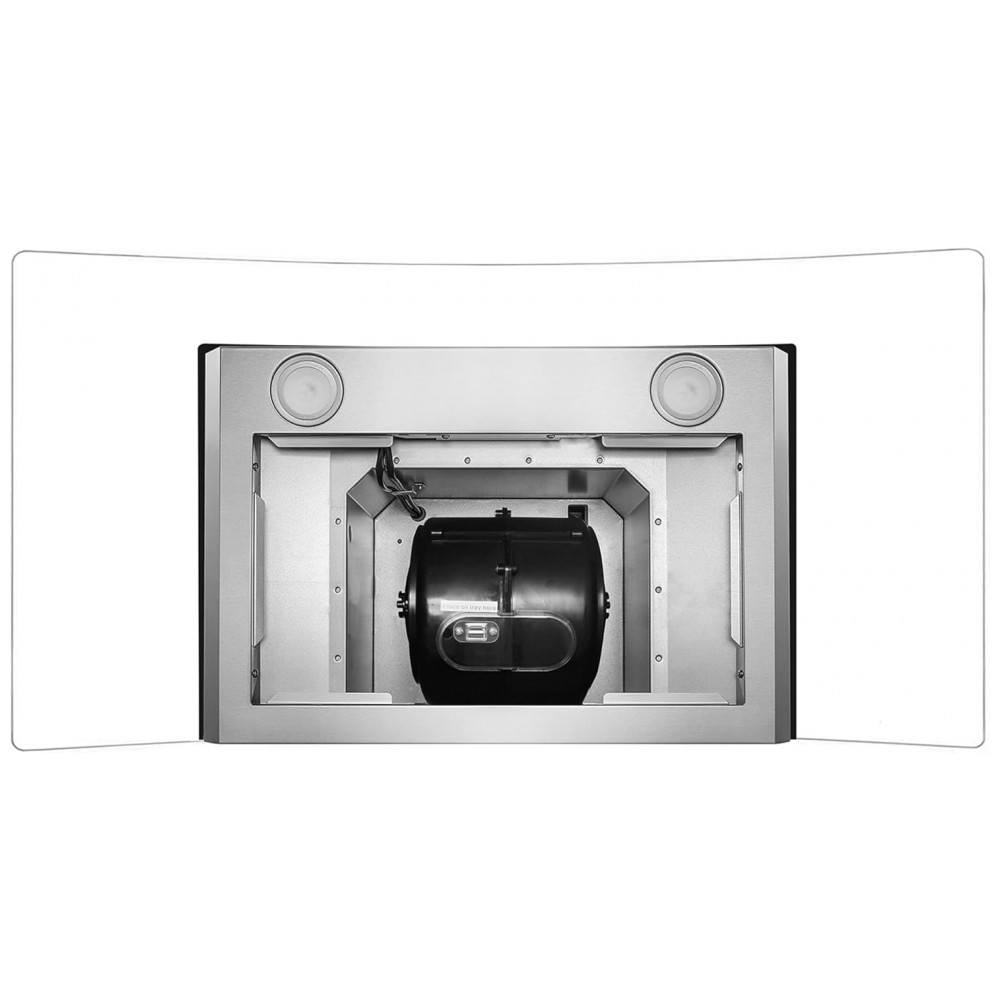 Material: Aço inoxidável escovado, vidro temperado curvo e filtros permanentes em aço inox