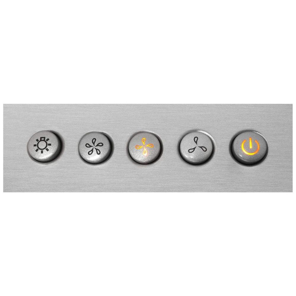 O painel frontal utiliza comandos por botão para acionar a coifa, selecionar uma das três velocidades do ventilador e ligar ou desligar a iluminação, permitindo operação direta e segmentada das principais funções. A iluminação da superfície de cocção é feita por LEDs frontais de 2 W, instalados na parte inferior do conjunto, fornecendo luz branca direcionada sobre o fogão ou cooktop para melhor visualização durante o uso.