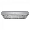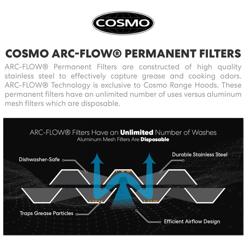 Recursos e tecnologias: Motor centrífugo com 3 velocidades, filtros permanentes em aço inox tipo ARC-FLOW, comandos por botão frontal, iluminação LED frontal, chaminé telescópica, operação em modo ductado com opção de conversão para modo recirculante com filtro de carvão ativado compatível, duto superior circular 15 cm com damper de retorno