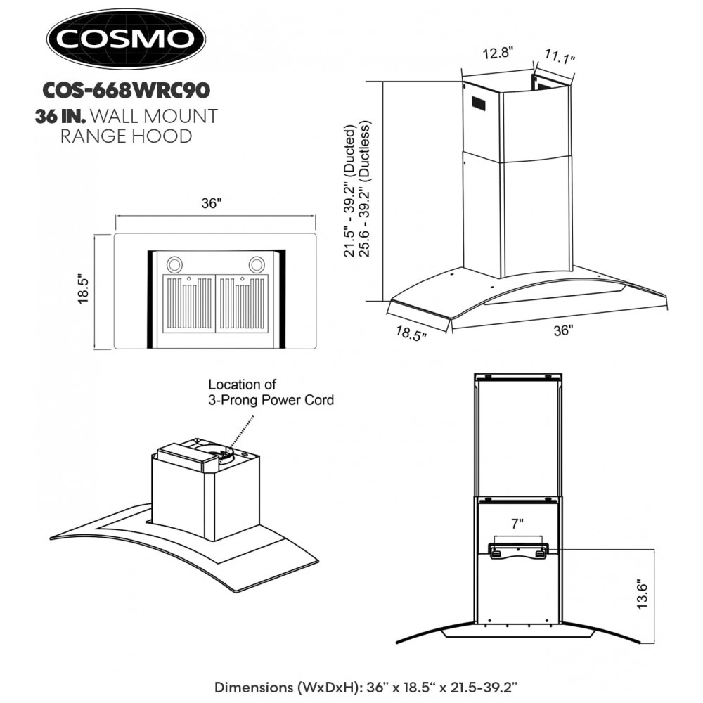 Conteúdo da embalagem: Coifa de parede COS-668WRC90, filtros permanentes em aço inox, chaminé telescópica, duto de exaustão 15 cm, damper de retorno, kit de fixação e instalação, cabo de alimentação com plugue de 3 pinos, manual do usuário em inglês