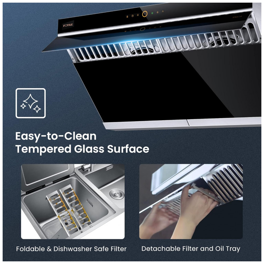 Limpeza e manutenção: Filtros baffle e bandejas de gordura removíveis para limpeza, superfície em vidro temperado adequada para higienização com pano macio e produto de limpeza neutro