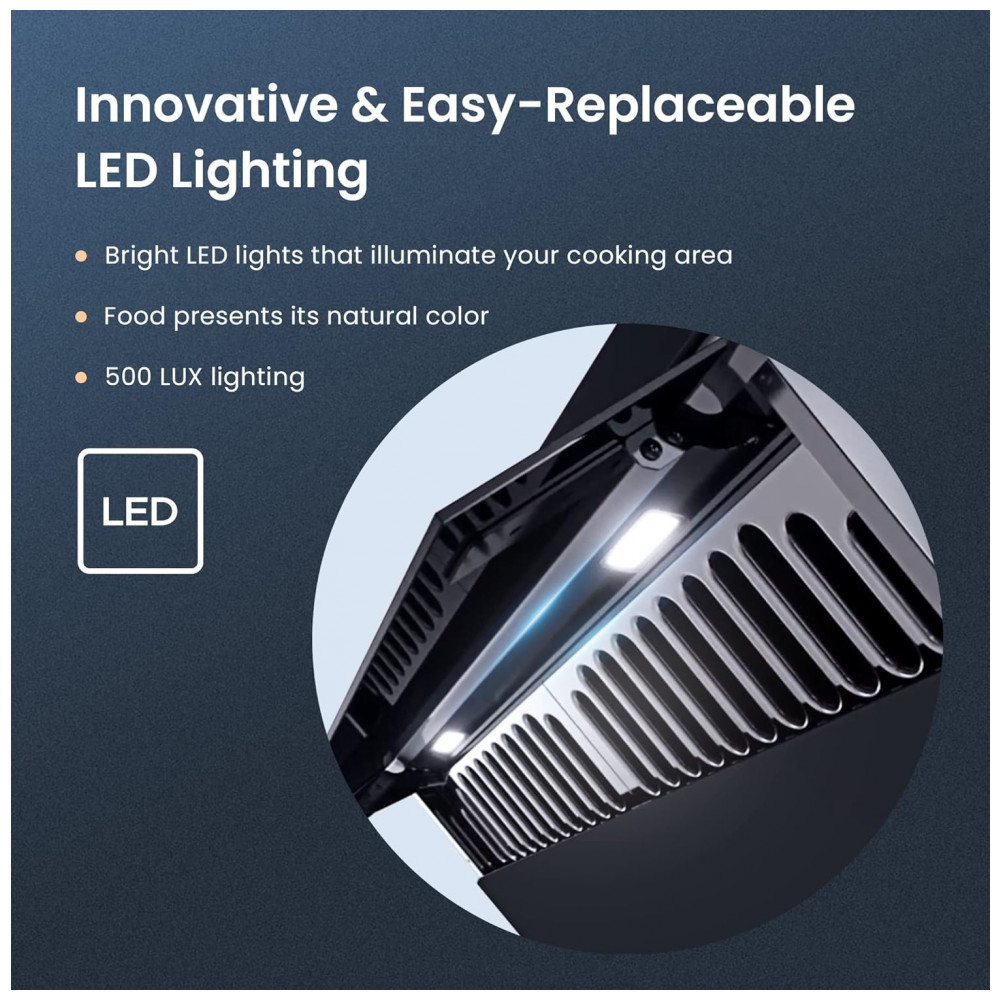 Recursos e tecnologias: Motores DC duplos, placa de captura com abertura automática a 90°, comando por toque, ativação por movimento, 4 velocidades, função desligamento automático, iluminação LED, filtros baffle metálicos removíveis, bandejas coletoras de gordura