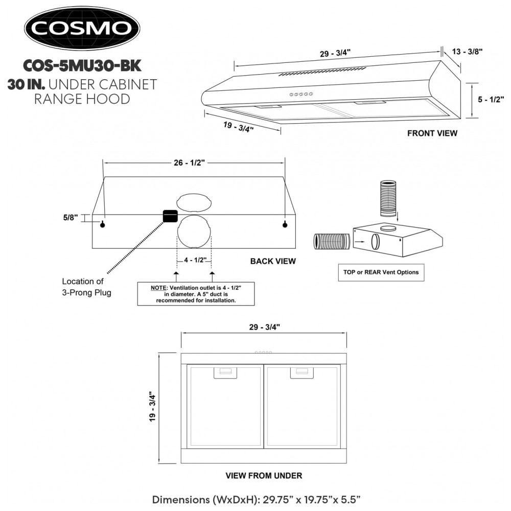 A coifa de embutir sob armário COSMO COS-5MU30-BK é indicada para cozinhas residenciais que necessitam de exaustão compacta em espaços com armários superiores, oferecendo perfil slim para melhor aproveitamento da área. O equipamento permite instalação sob gabinete ou diretamente contra a parede, com saída superior ou traseira por duto redondo de 13 cm de diâmetro, podendo operar em modo com duto ou em modo recirculante mediante uso de filtro de carvão específico.