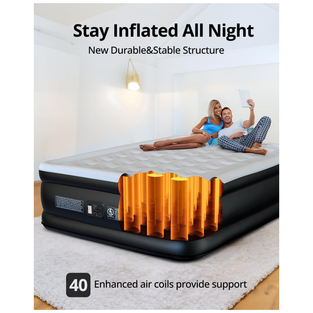 O colchão de ar Queen Airefina possui uma superfície superior flocada amigável à pele, com múltiplas camadas de maciez. O tecido de alta qualidade é suave e respirável. Equipado com bomba elétrica integrada de alta potência, o colchão infla e desinfla rapidamente em menos de 3 minutos. Sua estrutura de 48 bobinas de ar avançadas proporciona suporte firme e distribui uniformemente o peso, suportando até 340kg. Fácil de configurar e armazenar, vem com uma bolsa de transporte. Feito com PVC resistente e durável, é resistente ao desgaste e deformação.