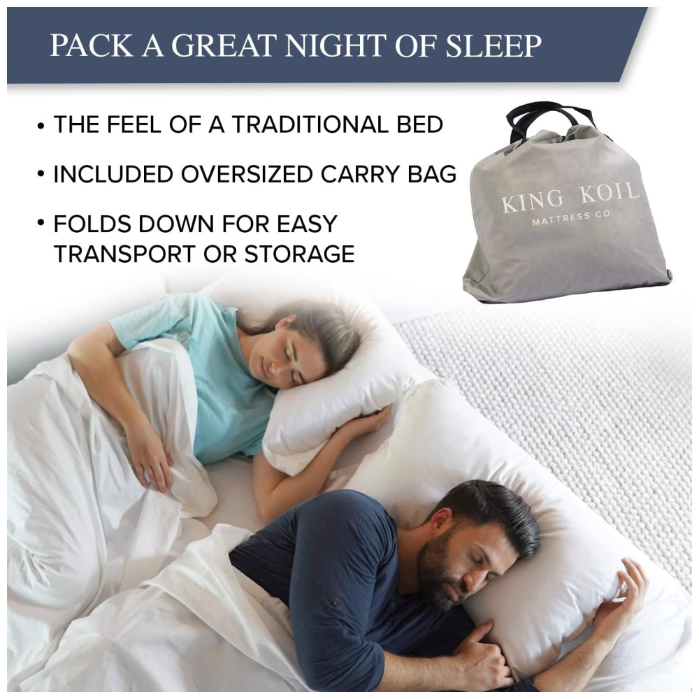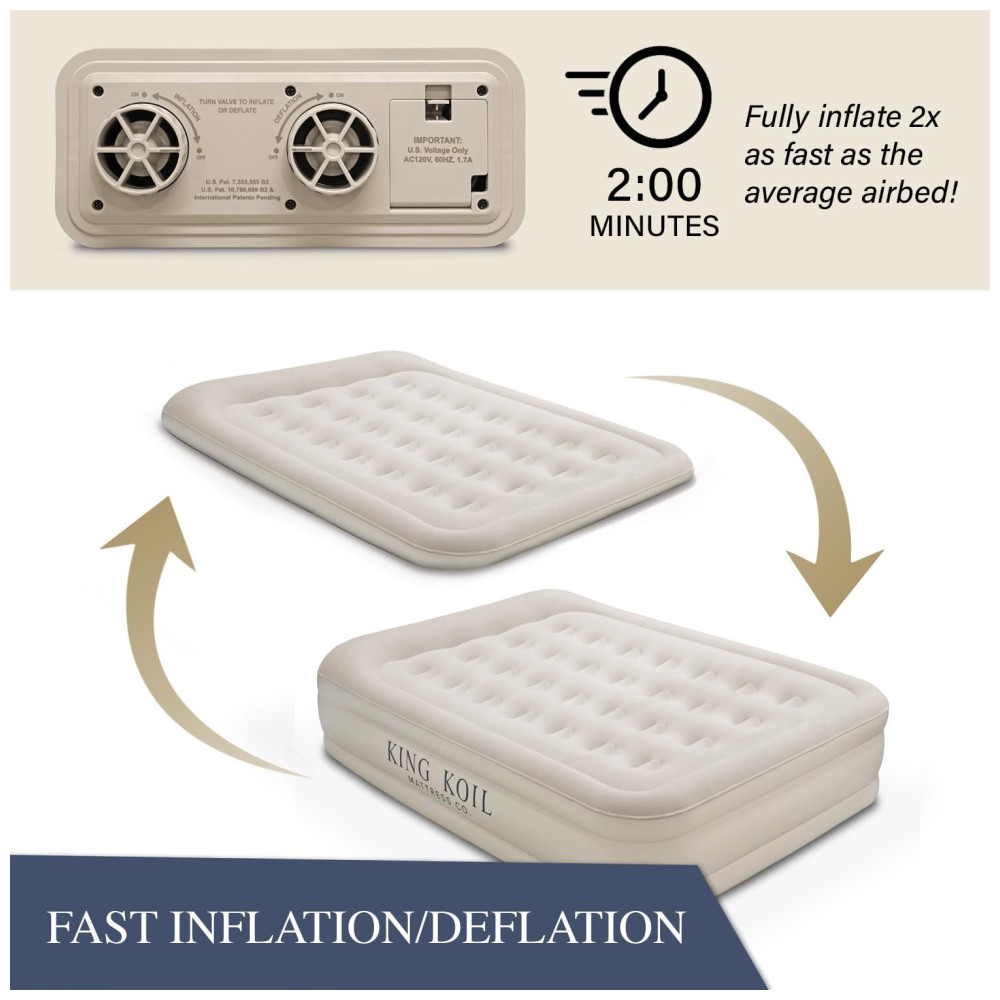 O último Colchão de Ar que você comprará. Tecnologia aprimorada da King Koil para colchão de ar tamanho completo, com camada macia aveludada e travesseiro embutido. Construído para oferecer máximo conforto, garantimos a qualidade! Colchão à prova d’água, espesso e durável, com topo acolchoado de conforto extra e suporte espinhal firme para postura de sono adequada. A bomba integrada possui botões separados para inflar e desinflar rapidamente. Colchão de ar tamanho completo com construção em feixes de bobina e bomba AC 110v 210w integrada, dimensões infladas de 190.5cm x 137.2cm x 50.8cm. Fácil de usar, a bomba interna permite inflar e desinflar rapidamente. O colchão King Koil atinge inflação total em menos de 2 minutos. Projetado para uso em casa, é perfeito para hóspedes, amigos, parentes e acampamentos. Lembre-se, embora mantenha o ar extremamente bem, você sempre pode ligar a bomba por alguns segundos para inflar ou desinflar ao seu nível de conforto desejado! A King Koil é a única fabricante endossada pela Associação Internacional de Quiropraxia para promover o alinhamento adequado da coluna e uma noite de sono mais saudável.