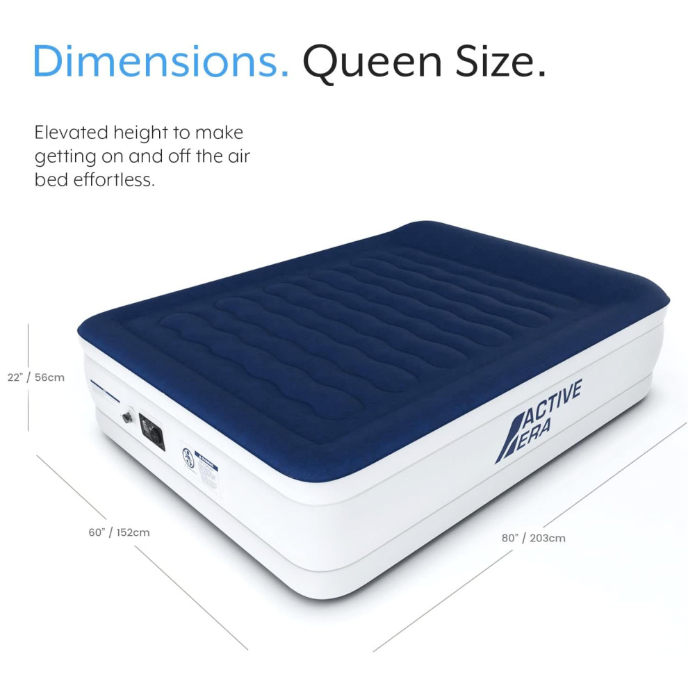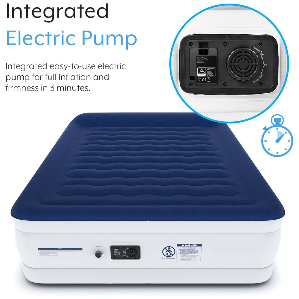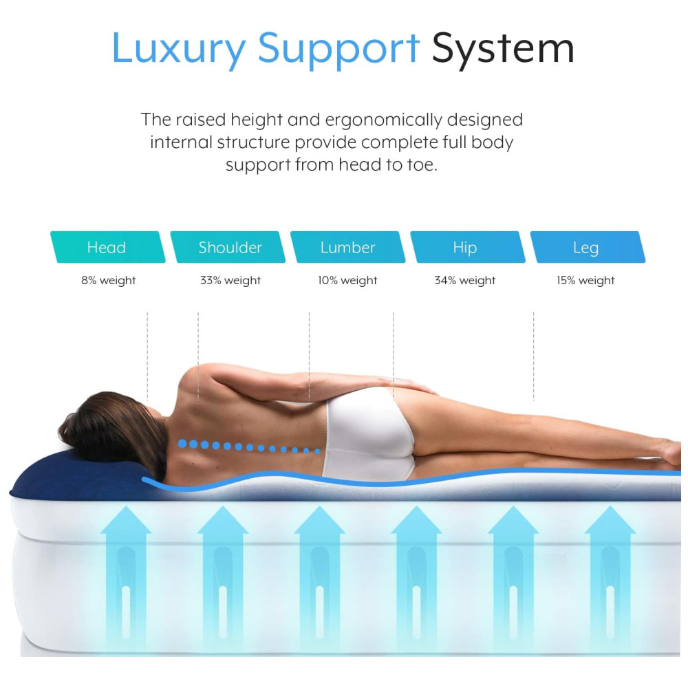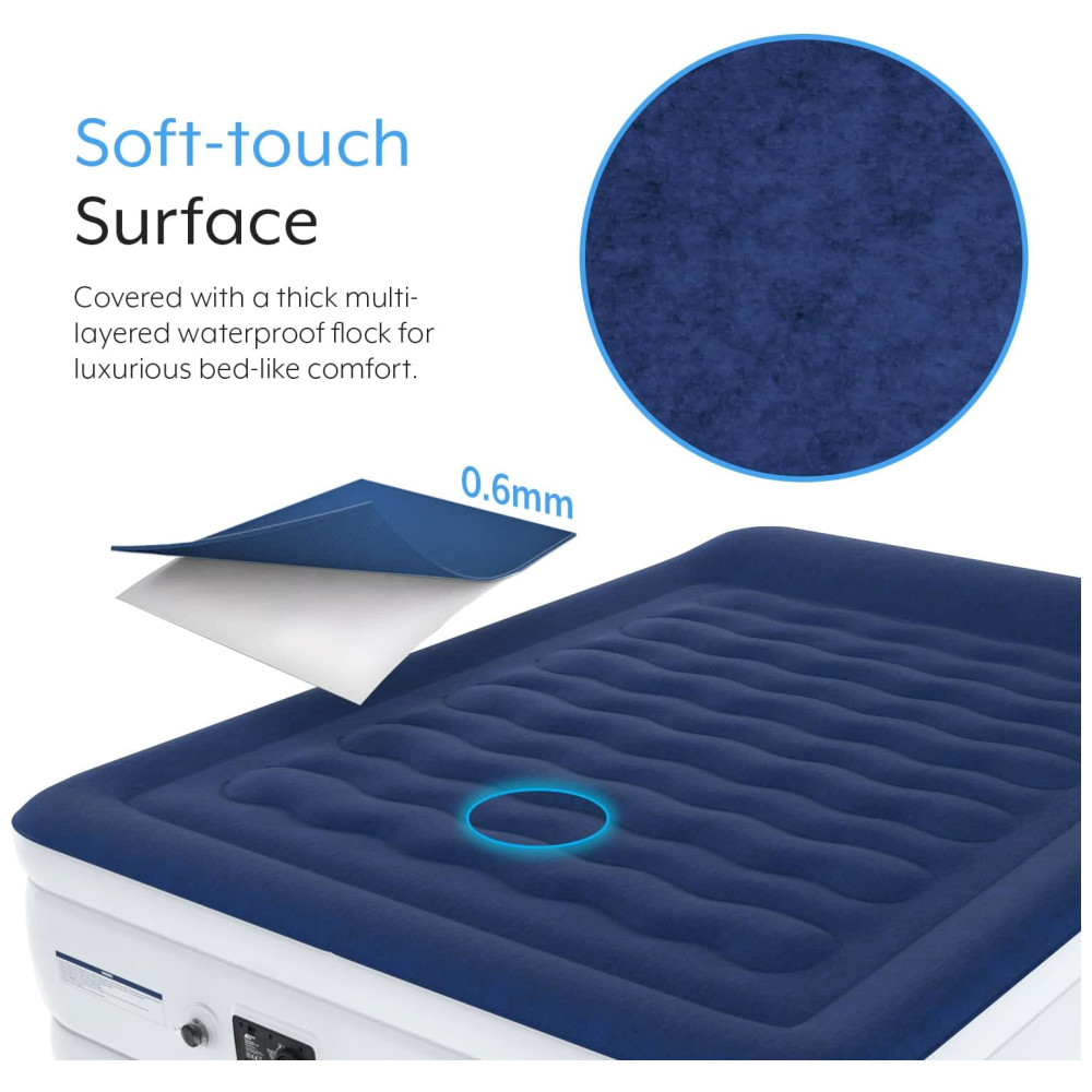NOSSO AIRBED MAIS AVANÇADO Projetado com uma estrutura de suporte interna que imita o design de uma cama regular para fornecer suporte e conforto incomparáveis durante toda a noite. Uma mala de viagem está incluída para facilitar a embalagem e o transporte. BOMBA AC ELÉTRICA INCORPORADA Uma bomba CA integrada e fácil de usar infla rapidamente com firmeza total em 3 minutos. Ao pressionar um botão, ele esvaziará automaticamente o colchão de ar para que possa ser zenado em pequenos espaços. SUPORTE AO PESCOÇO E À CABEÇA Um travesseiro construído ergonomicamente segue a curvatura do pescoço e da coluna para proporcionar conforto incomparável enquanto você dorme, garantindo que se sinta totalmente revigorado pela manhã. ESTRUTURA DURÁVEL Uma camada superior flocada impermeável, espessa e resistente, foi projetada com um material durável e resistente a perfurações de multicamadas. TAMANHO DA RAINHA GRANDE Colchão de ar de altura elevada. Remendos para reparo de perfurações e bolsa de transporte incluídos