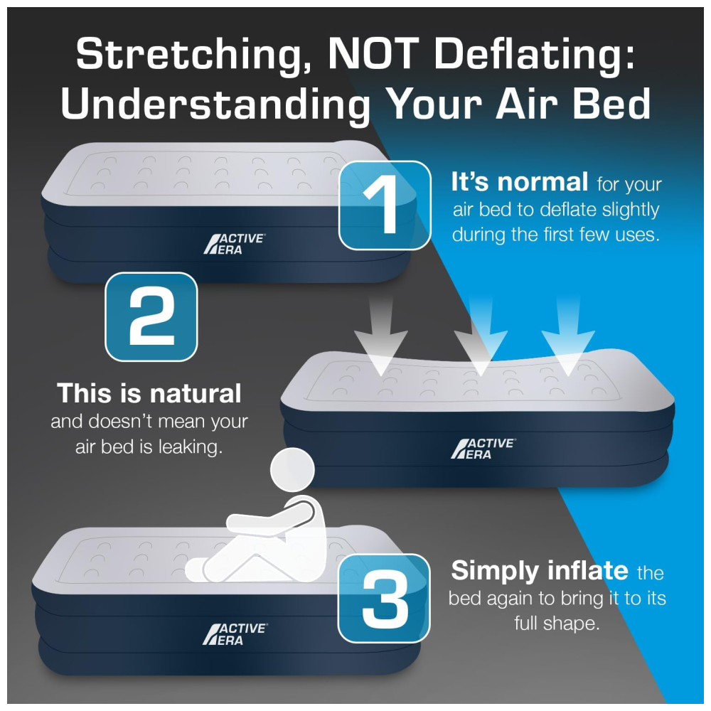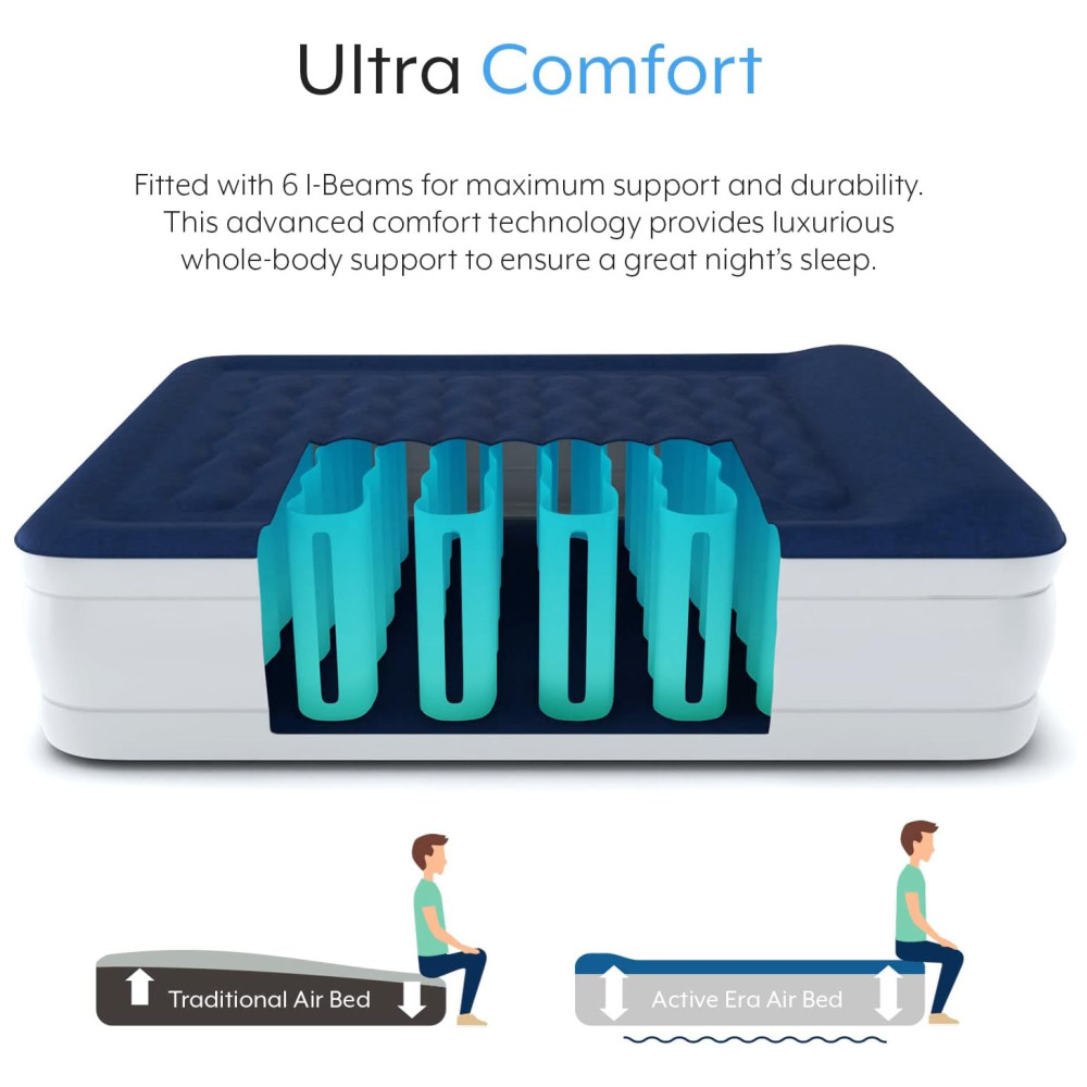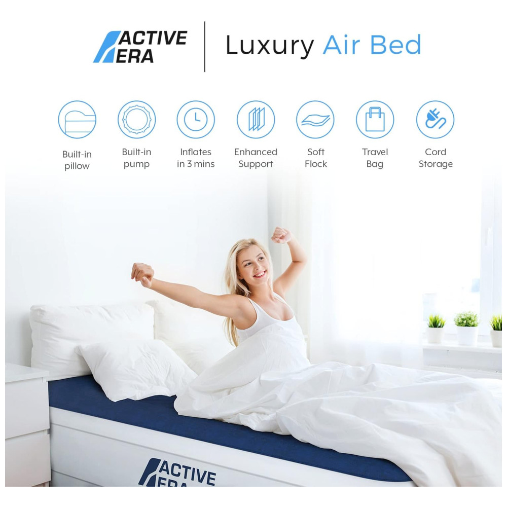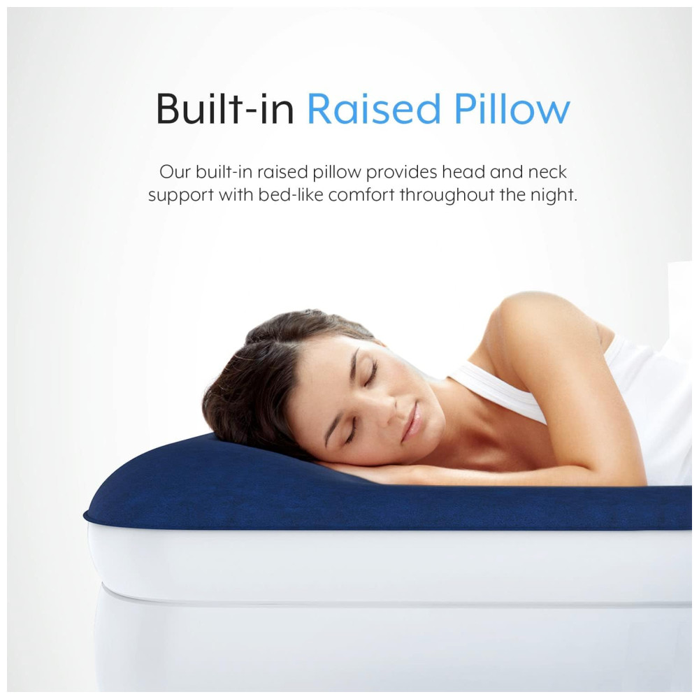 NOSSO AIRBED MAIS AVANÇADO Projetado com uma estrutura de suporte interna que imita o design de uma cama regular para fornecer suporte e conforto incomparáveis durante toda a noite. Uma mala de viagem está incluída para facilitar a embalagem e o transporte. BOMBA AC ELÉTRICA INCORPORADA Uma bomba CA integrada e fácil de usar infla rapidamente com firmeza total em 3 minutos. Ao pressionar um botão, ele esvaziará automaticamente o colchão de ar para que possa ser zenado em pequenos espaços. SUPORTE AO PESCOÇO E À CABEÇA Um travesseiro construído ergonomicamente segue a curvatura do pescoço e da coluna para proporcionar conforto incomparável enquanto você dorme, garantindo que se sinta totalmente revigorado pela manhã. ESTRUTURA DURÁVEL Uma camada superior flocada impermeável, espessa e resistente, foi projetada com um material durável e resistente a perfurações de multicamadas. TAMANHO DA RAINHA GRANDE Colchão de ar de altura elevada. Remendos para reparo de perfurações e bolsa de transporte incluídos