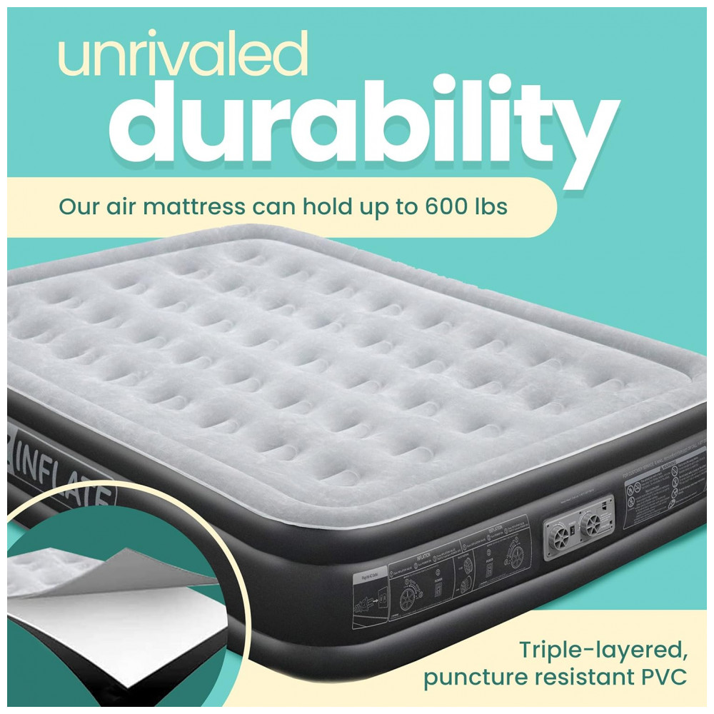 IMPERMEÁVEL Impermeável e resistente a perfurações, nosso colchão inflável completo é feito de PVC durável de camada tripla. Cada colchão de viagem ou acampamento pode suportar até 300 kg