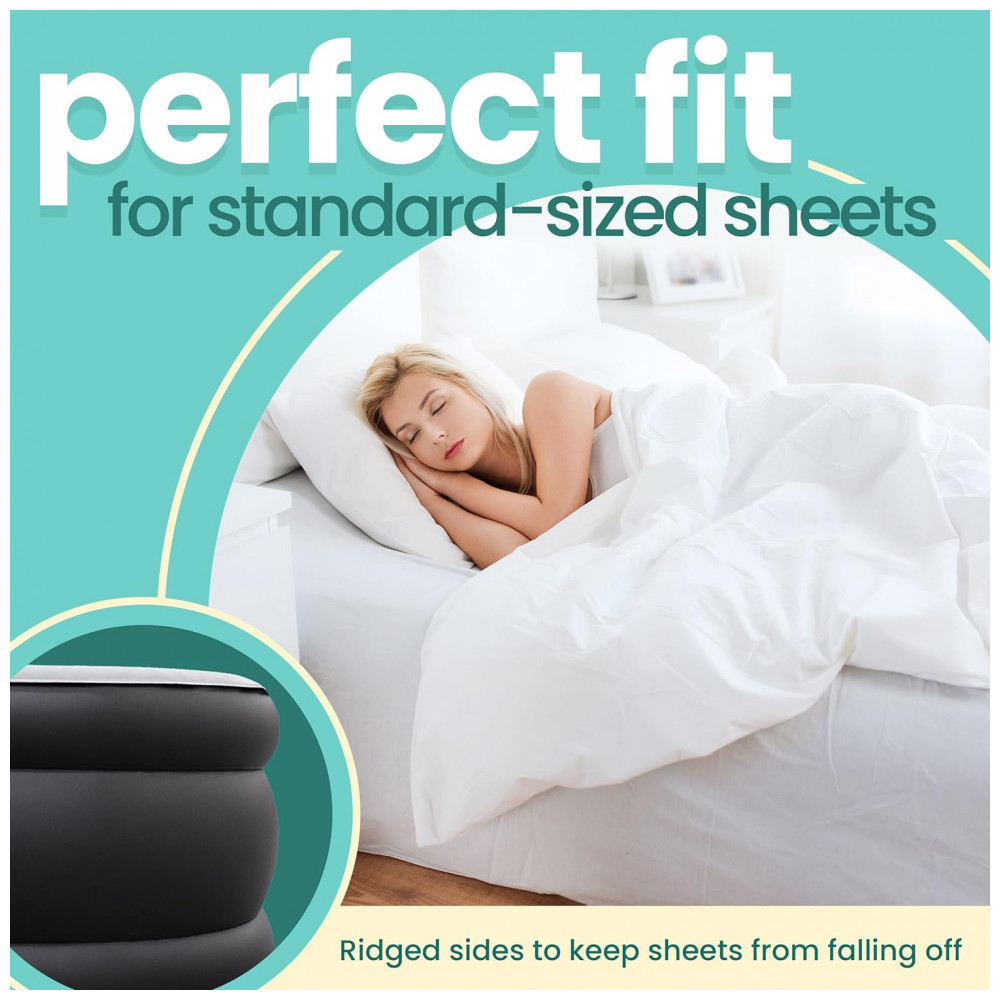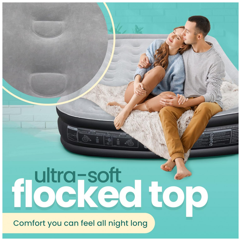 ALTO DUPLO Este colchão inflável de de altura dupla tem um top flocado premium ultramacio para estabilidade antiderrapante onde quer que você descanse a cabeça. A tecnologia de feixe de bobina fornece conforto e suporte de colchão real.