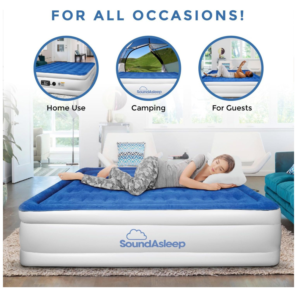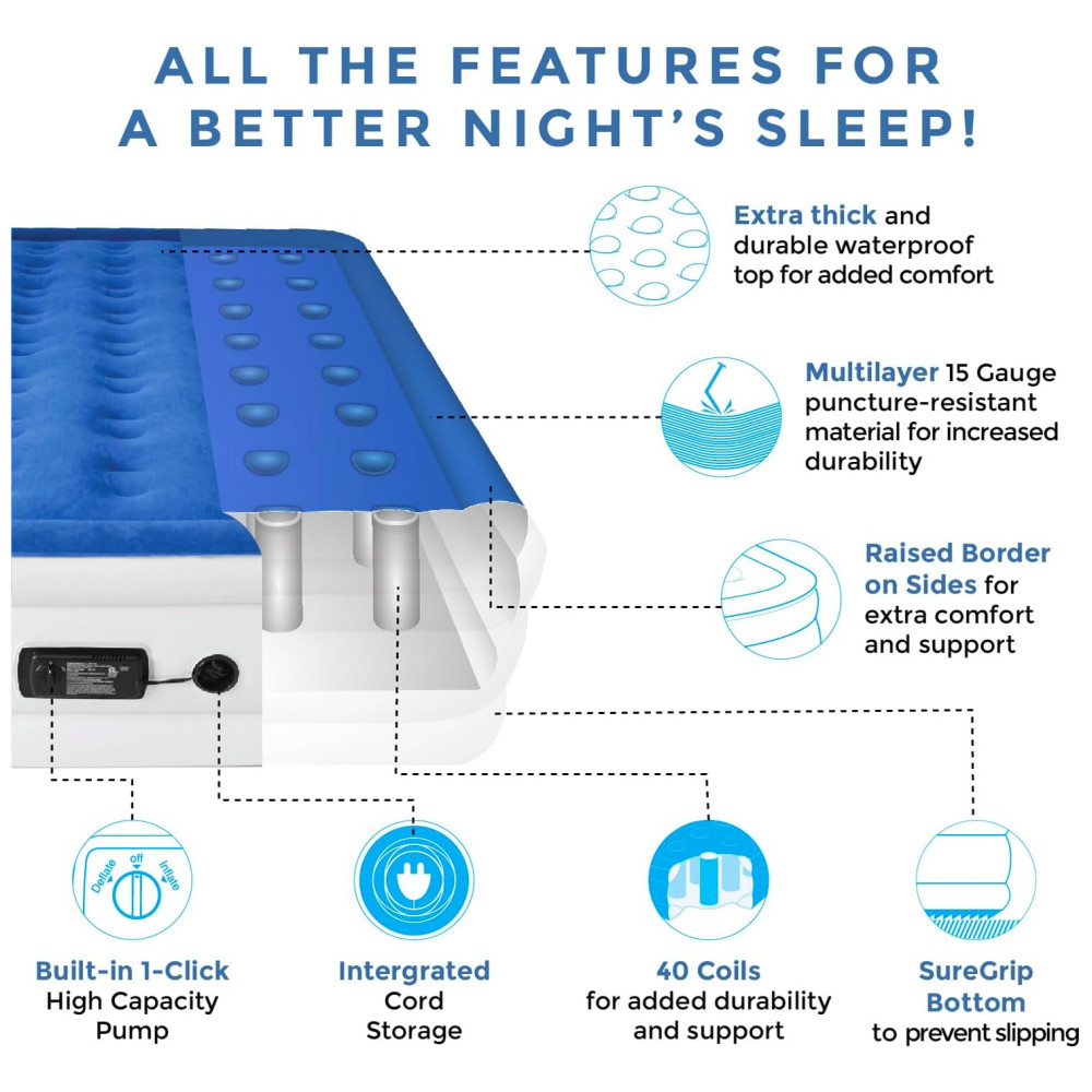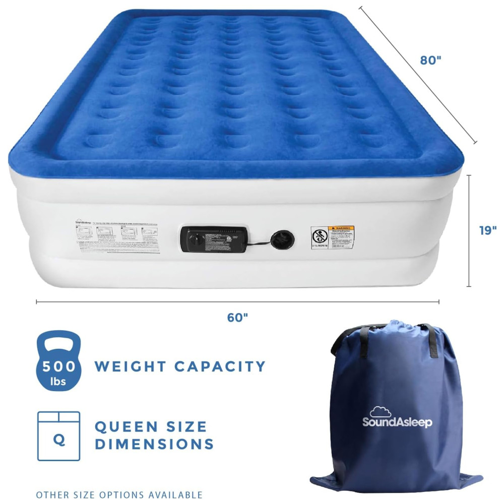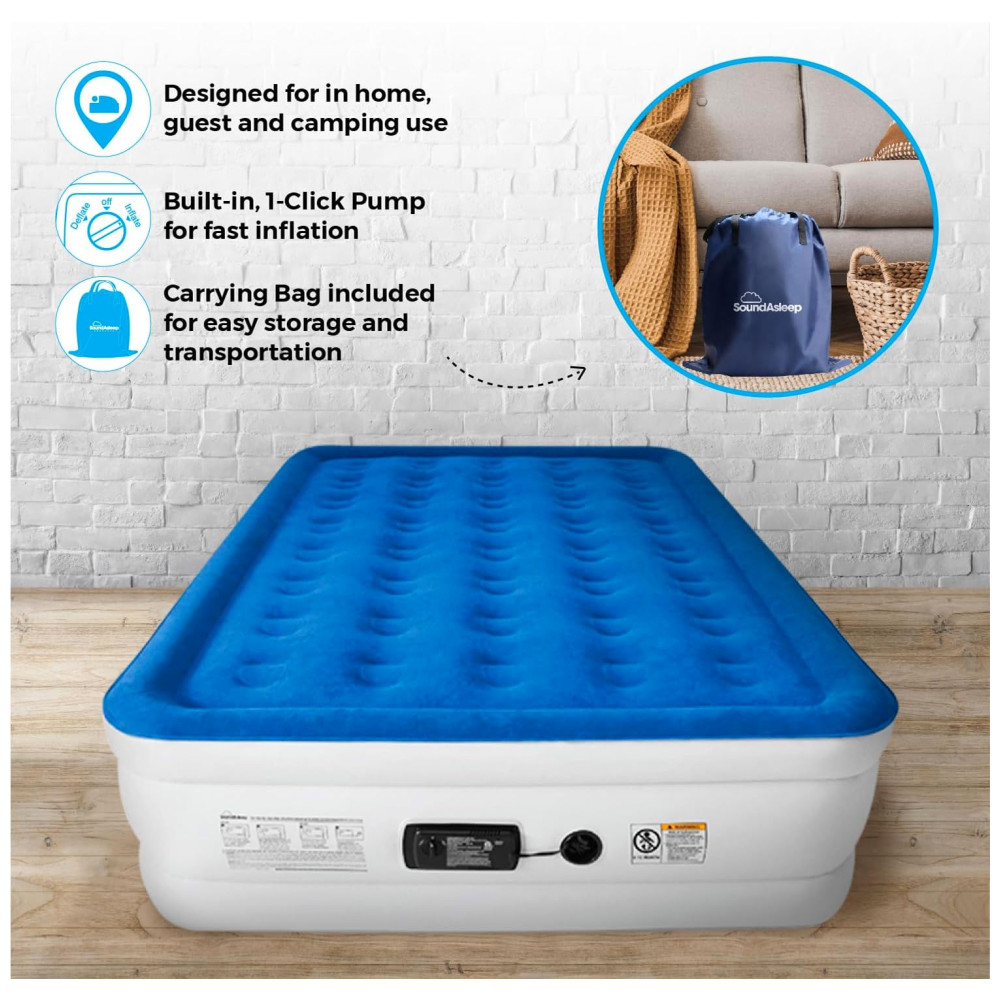 SoundAsleep. Fique tranqilo com a compra do colchão de ar de alta qualidade que o dinheiro pode comprar. Ligue ou envie um e mail a qualquer momento para obter suporte. Nossa equipe baseada nos EUA está aqui para ajudar DESIGN PRINCIPAL DA INDÚSTRIA utilizando exclusivamente a tecnologia ComfortCoil e um fundo SureGrip para garantir firmeza e estabilidade. Não escorregar e deslizar Com 40 bobinas de ar internas para maior durabilidade e suporte a sua cama permanecerá plana e firme para que você possa ficar SoundAsleep BOMBA INTERIOR PATENTEADA DE 1 CLIQUE, que garante inflação e deflação rápidas e fáceis. Projetado para uso em casa, o colchão Queen Size Dream Series atinge a inflação completa em menos de 4 minutos e permanecerá inflado por dias. Se você preferir uma superfície mais firme, use a bomba para uma recarga rápida CAMA DE AR ELEVADA PREMIUM Altura Dupla com construção de dupla câmara. Com dimensões infladas de 78 x 58 x 19 198cm x 147cm x 48.26cm, este colchão é grande o suficiente para dormir duas pessoas confortavelmente ou uma pessoa como um rei Convidados, amigos e parentes de todas as formas e tamanhos ficarão encantados. Para um colchão menor, confira nosso tamanho Twin SUPERIOR, SUPORTE FLOCADO À PROVA DE ÁGUA assegura uma experiência de sono confortável, enquanto o PVC Eco Amigável multicamadas, resistente a perfurações, torna este colchão extremamente durável e de longa duração